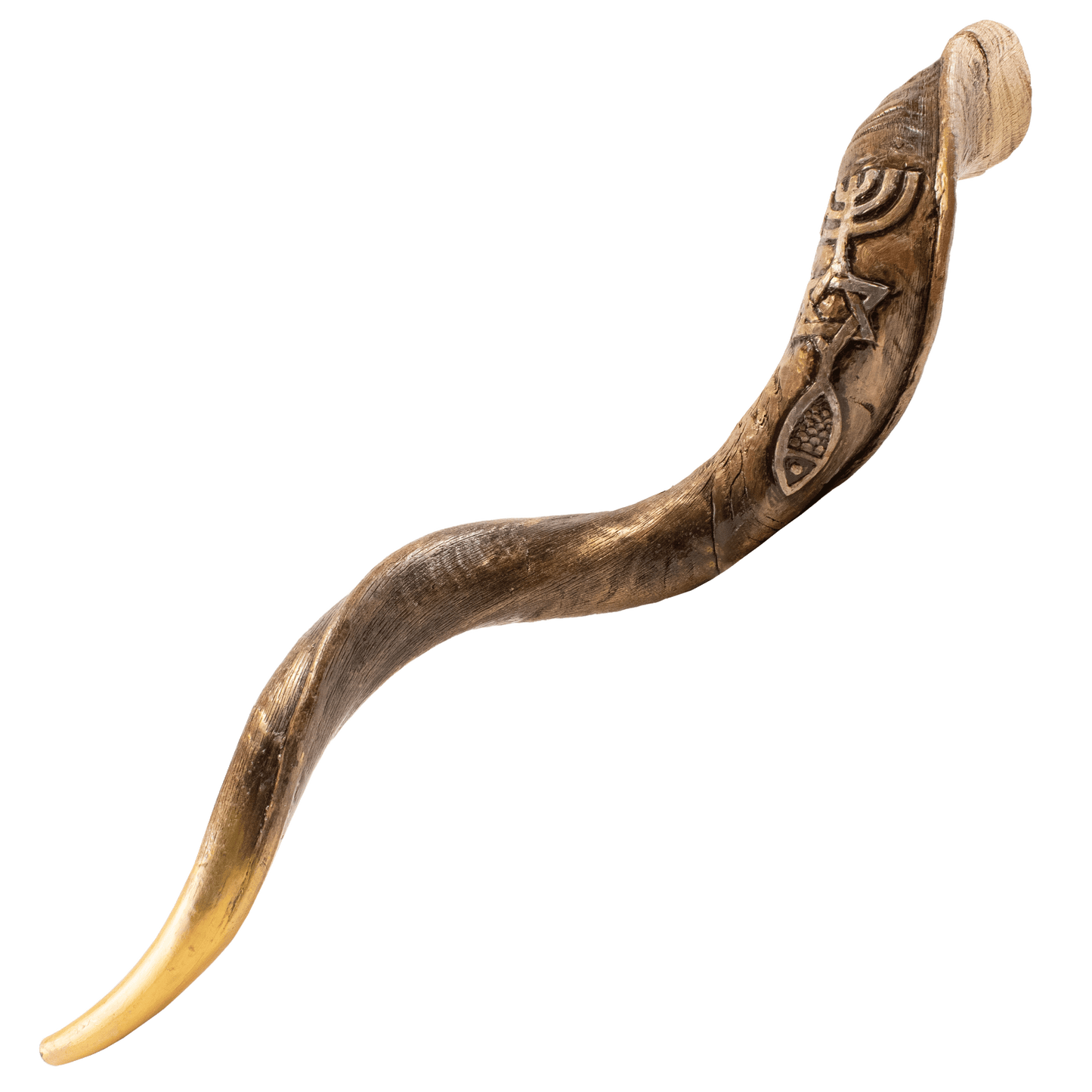 Experience the beauty of this stunning hand-carved 3D shofar adorned with the grafted-in symbol, also known as the One New Man. The addition of gold enamel paint accents further enhances its striking design.