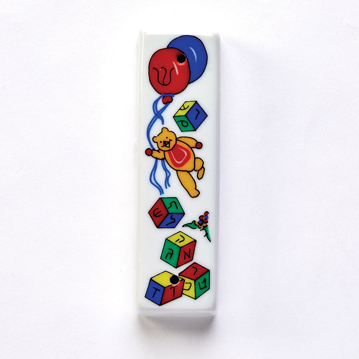 This beautiful Mezuzah, crafted on a white ceramic base, showcases delightful designs of balloons, blocks, and a bear, making it an ideal decorative piece for a nursery or child's room. While a Kosher scroll is not included with this case, it is available for separate purchase, allowing you to complete this meaningful addition to your child's space.