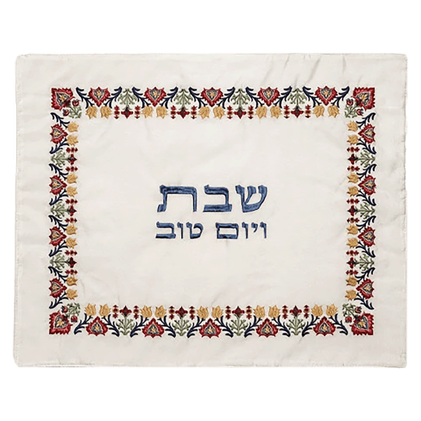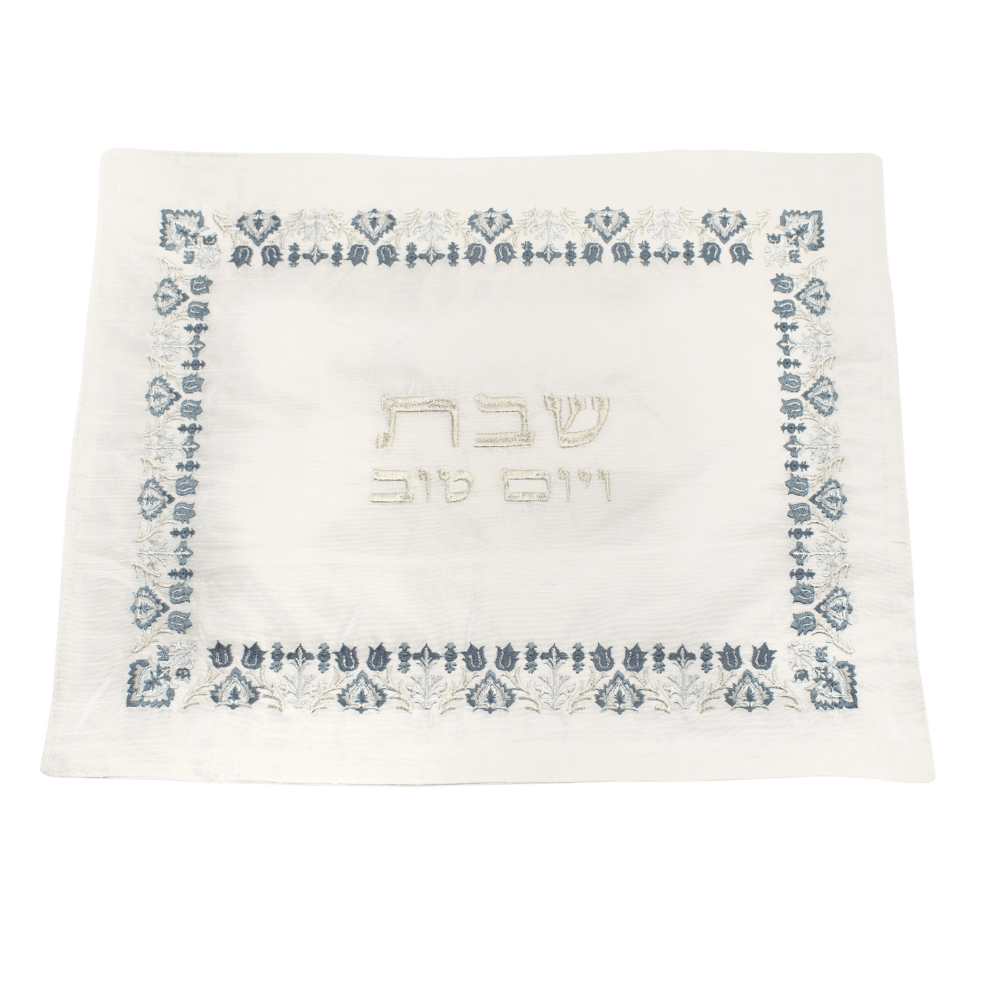 This challah cover features an antique-inspired design with a border of flowers framing the Hebrew words שבת ויום טוב (Shabbat veyom Tov) - "Shabbat a Good Day." This combination creates a charming and vintage aesthetic, adding a touch of beauty and tradition to your Shabbat table.