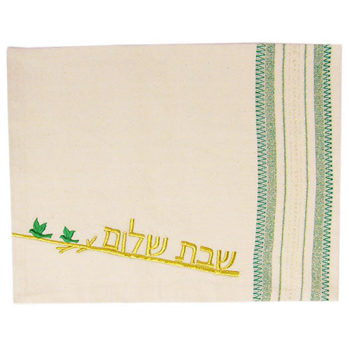 Beautiful hand-woven challah cover in an off-white linen style fabric. The Hebrew greeting "Shabbat Shalom" is embroidered in 1 1/4 inch high gold lettering that rests on a 1/4 inch wide gold branch. Near the end of the gold branch are two beautiful doves embroidered in green. At one 14" edge of the challah cover is a 5 1/2 inch border woven into the cover. Stripes designed in green, green and gold, gold, and self-fabric add a lovely elegance to this cover.