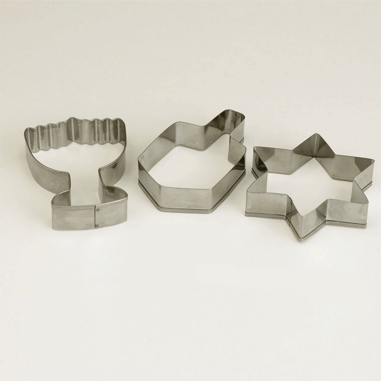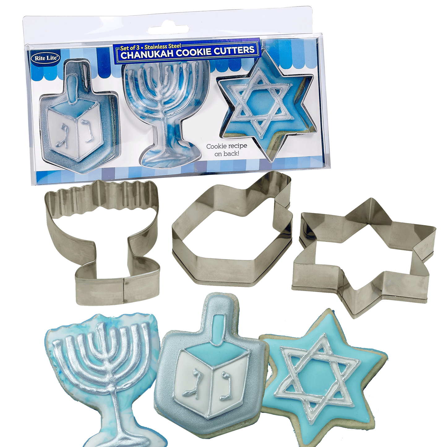 Celebrate the Festival of Lights with this Chanukah cookie cutter set, crafted from high-quality stainless steel! The cookie cutters are in the shapes of the menorah, dreidel, and Star of David. Whether you're craving something sweet or just looking for a fun festival activity, these cookie cutters are a great addition to any home. The stainless steel cookie cutters will last for many years so you and your family can enjoy several generations of Chanukah fun!