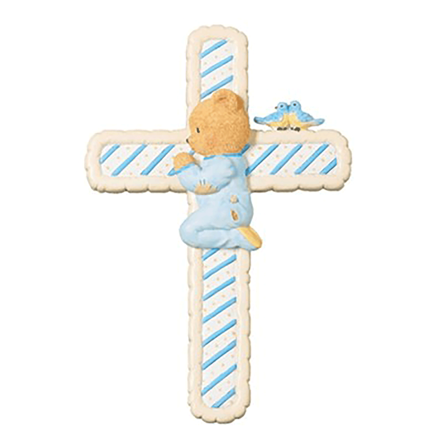 The endearing blue and white stripes serve as a delightful backdrop, while an adorable teddy bear is captured in prayer adds a touch of innocence and sweetness. This wall cross is not just a decorative piece but also a thoughtful and meaningful gift idea for baby showers and special baby occasions.