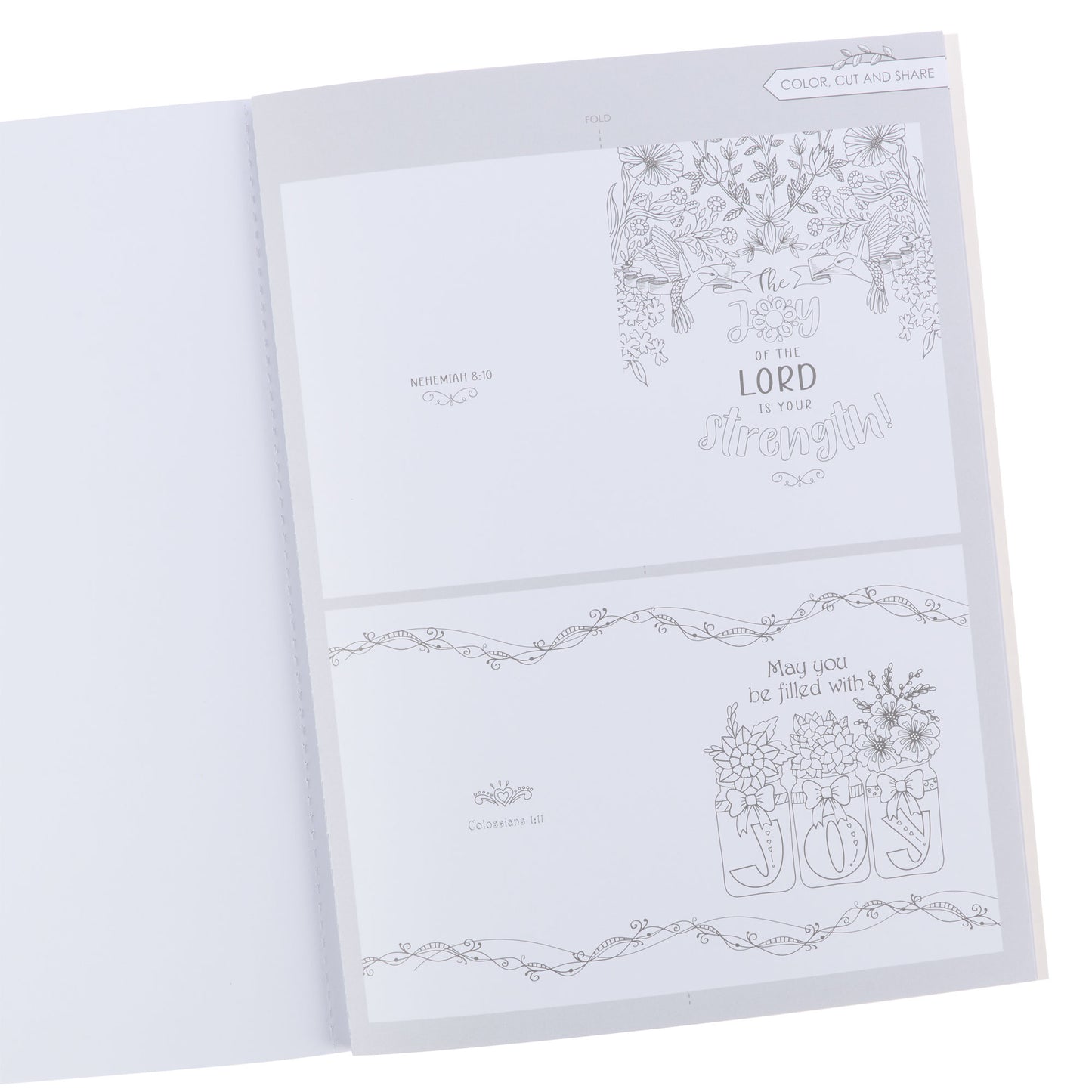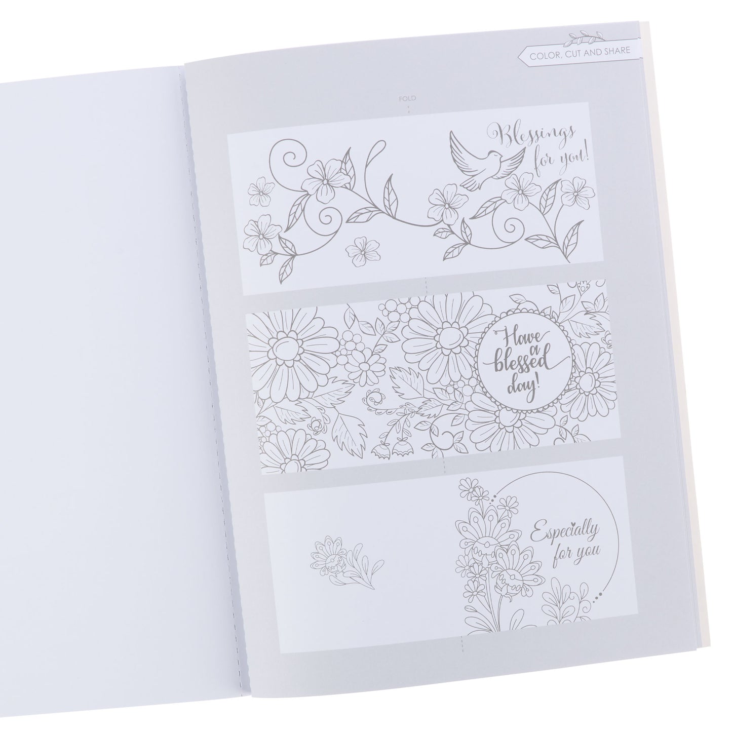 The coloring book's cover is made of heavy-duty cardstock. Inside are 55 beautifully designed single-sided printed Scripture verses to color. Perforated pages make creations easy to remove. Illustrations include full-page line drawings, cards, and bookmarks you can color and share.