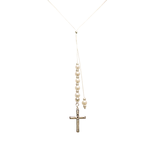 Step out in style with this Y-inspired necklace. This slider necklace features a dangling cross pendant on one and pearl and silver beads. The long silver chain is easily adjustable by sliding the silver bead up or down. Easily slides over your head.