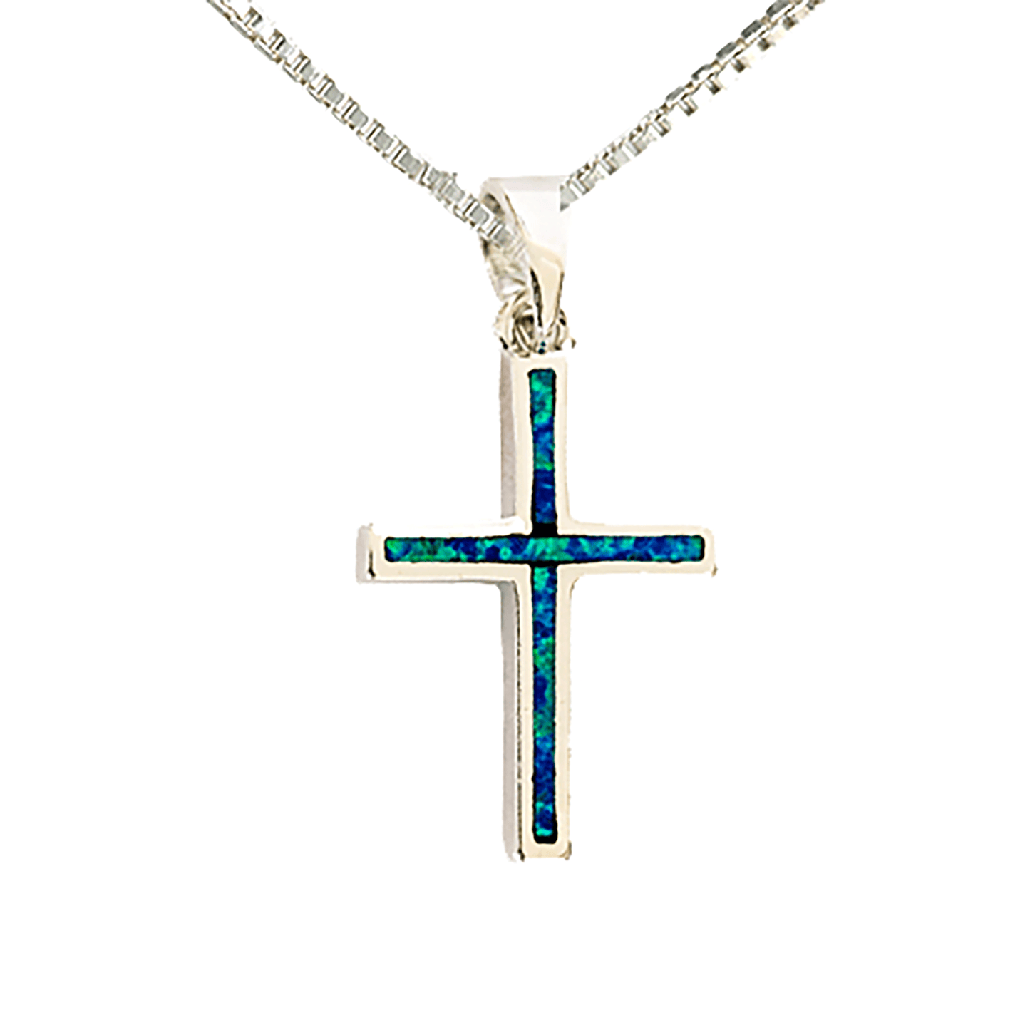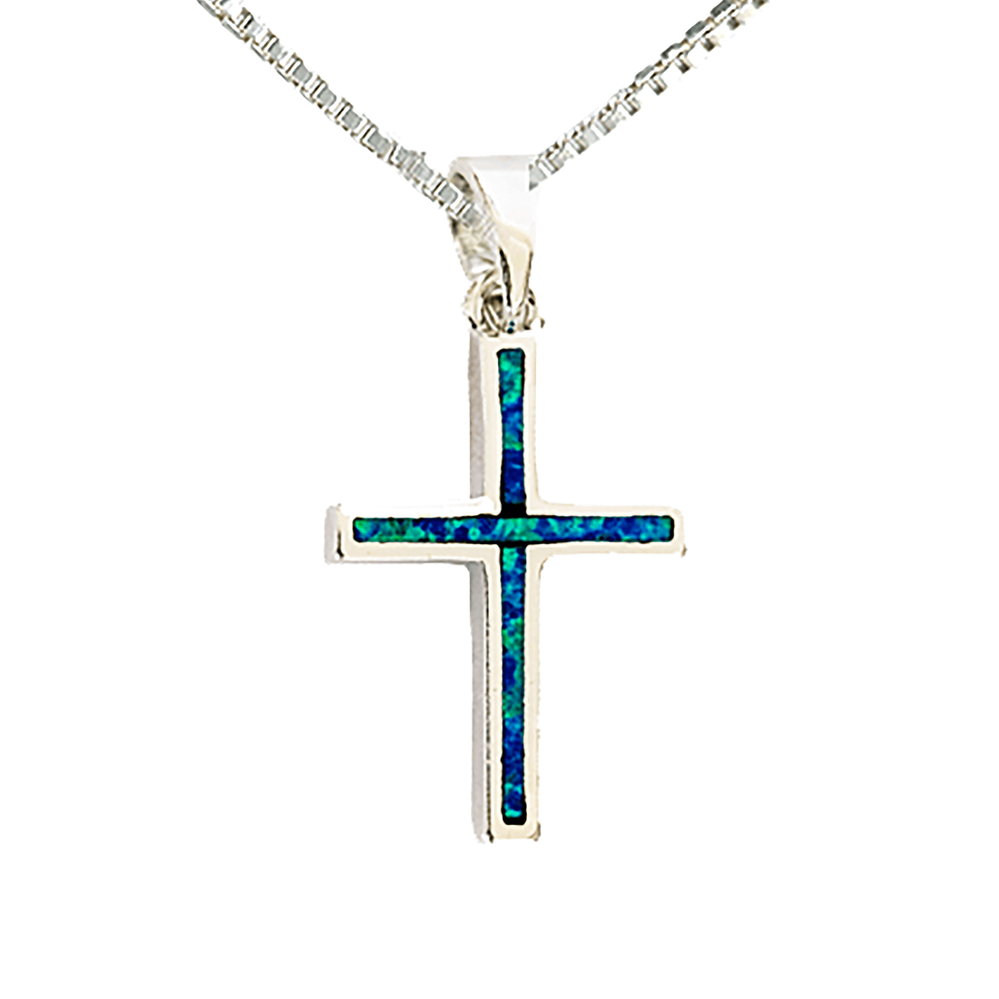 925 Silver Cross Pendant with Synthetic Opal inlay. Faith and fashion merge to create a pendant striking in its simplicity and beautiful in its meaning.