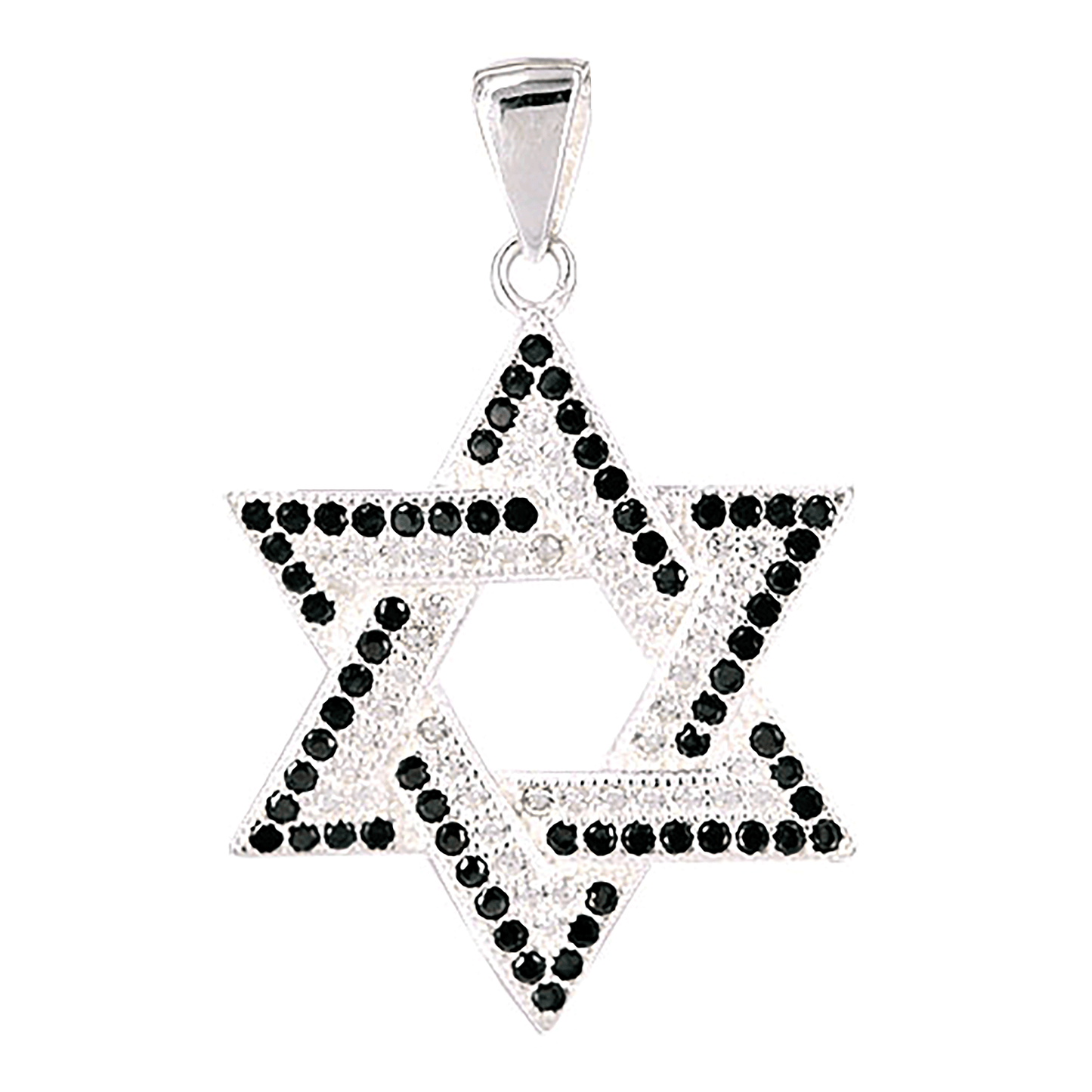 This Sterling Silver Star of David necklace is elegantly adorned with onyx and Swarovski crystals. The is outlined with small shimmering black onyx stones, adding a bold contrast to the sleek silver. An inner outline sparkles with clear Swarovski crystals, creating a dazzling, eye-catching effect. The combination of black and clear crystals adds depth and sophistication to this piece, making it a meaningful and stylish accessory. Perfect for special occasions or everyday wear.