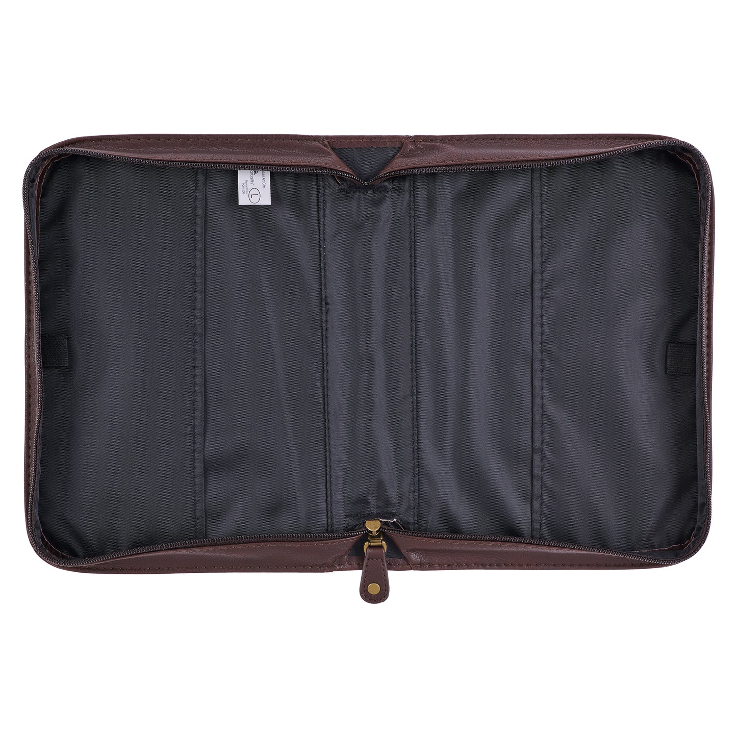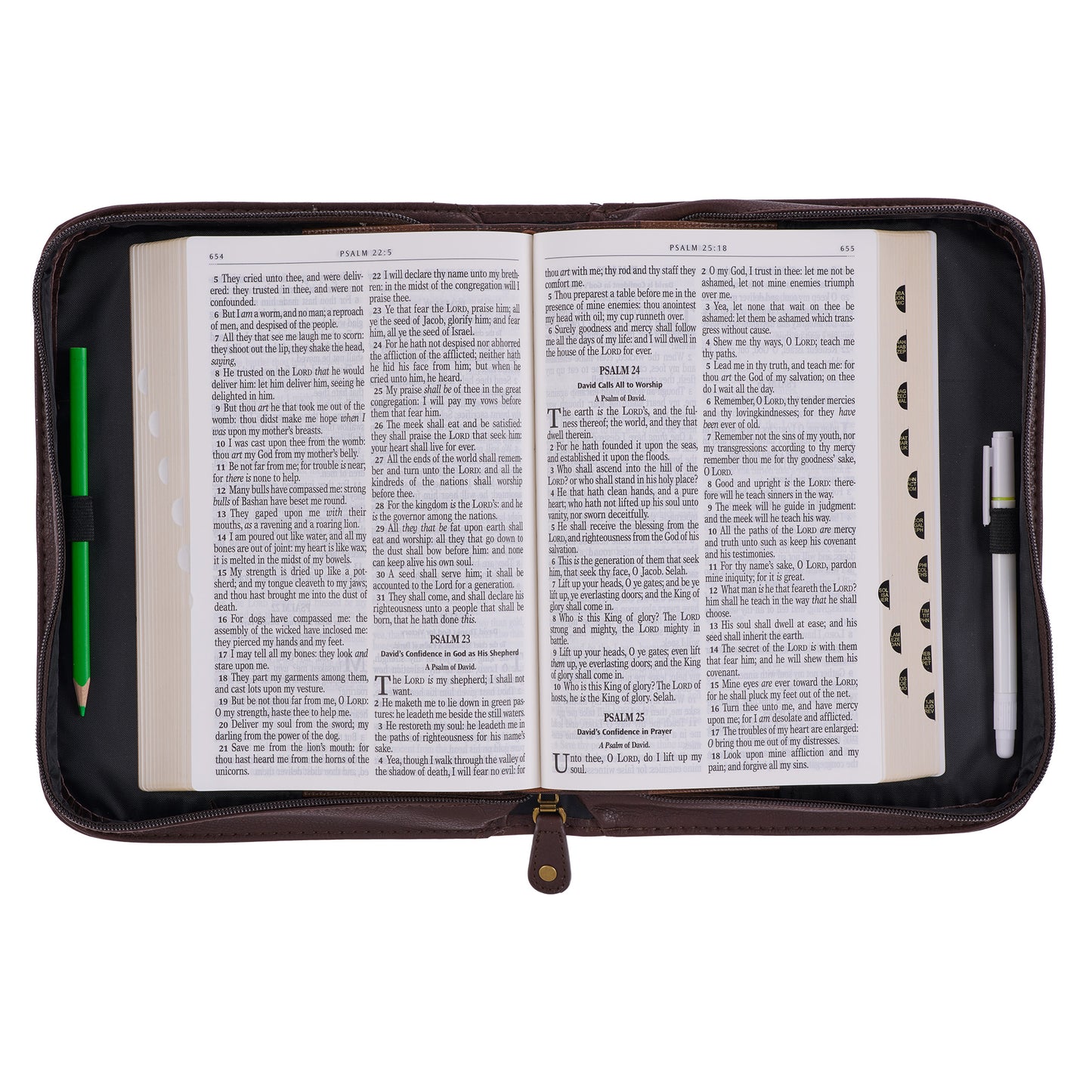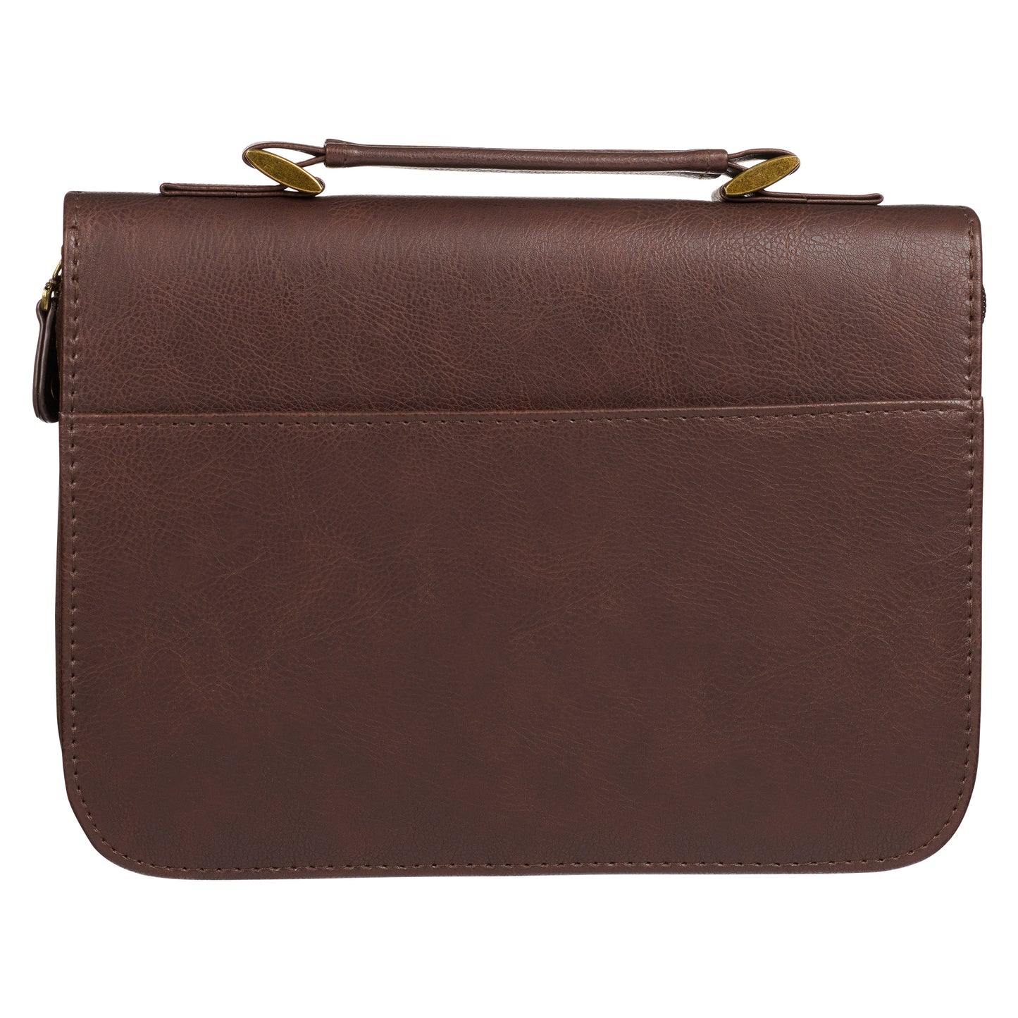 An easy-to-carry faux leather handle is attached with brushed gold metal hardware and folds completely flat when the cover is opened. This Bible case also comes with an exterior slip pocket and two interior pen loops, so you can keep all your materials safe in one place. Brown topstitching borders the edges and panels, lending durability to the design. The brown faux leather zipper pull glides closed smoothly to keep the Bible within entirely secure.