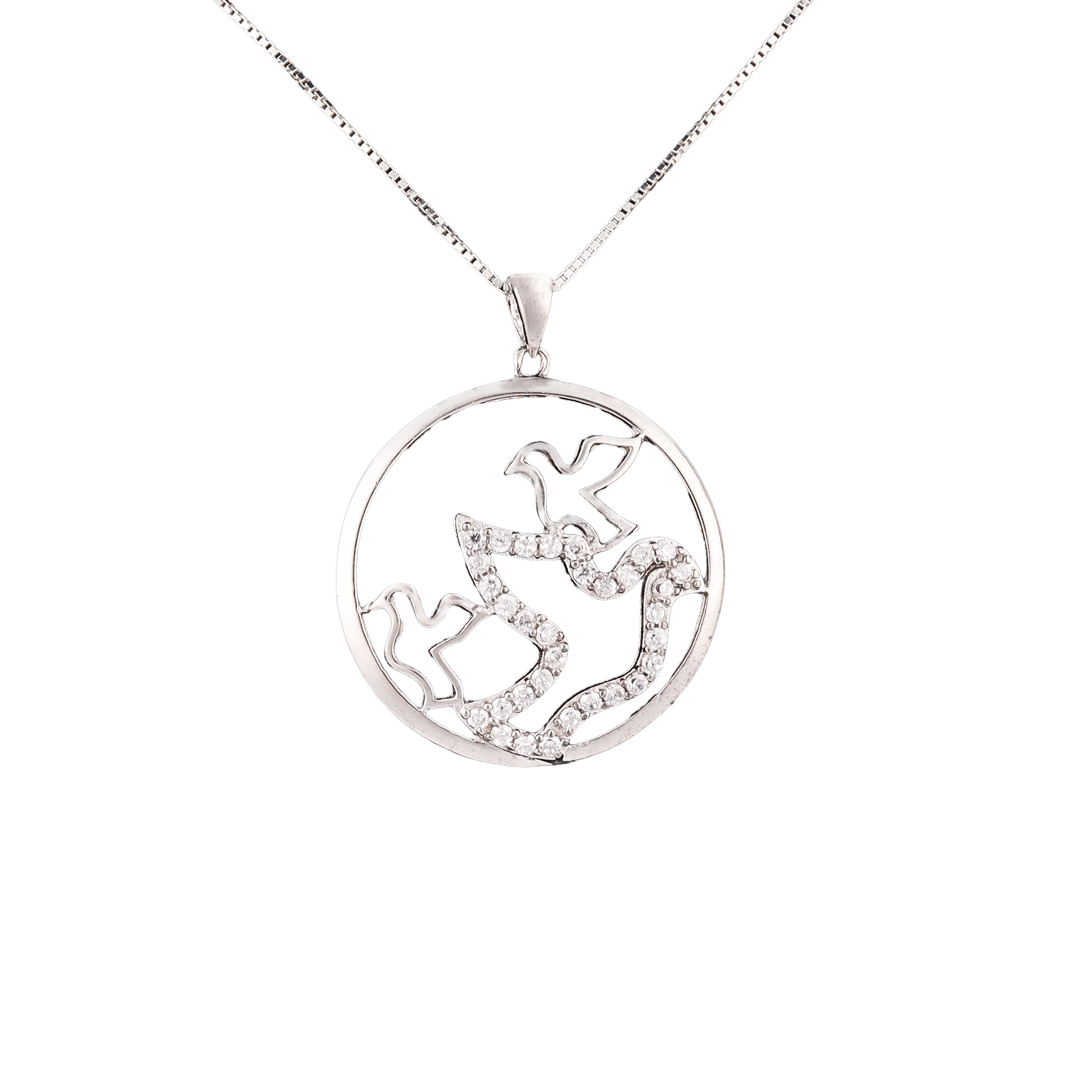 A graceful pendant featuring two doves enclosed within a polished round frame. Symbolizing peace and harmony, this timeless design is simple, elegant, and perfect for everyday wear or as a meaningful gift.
