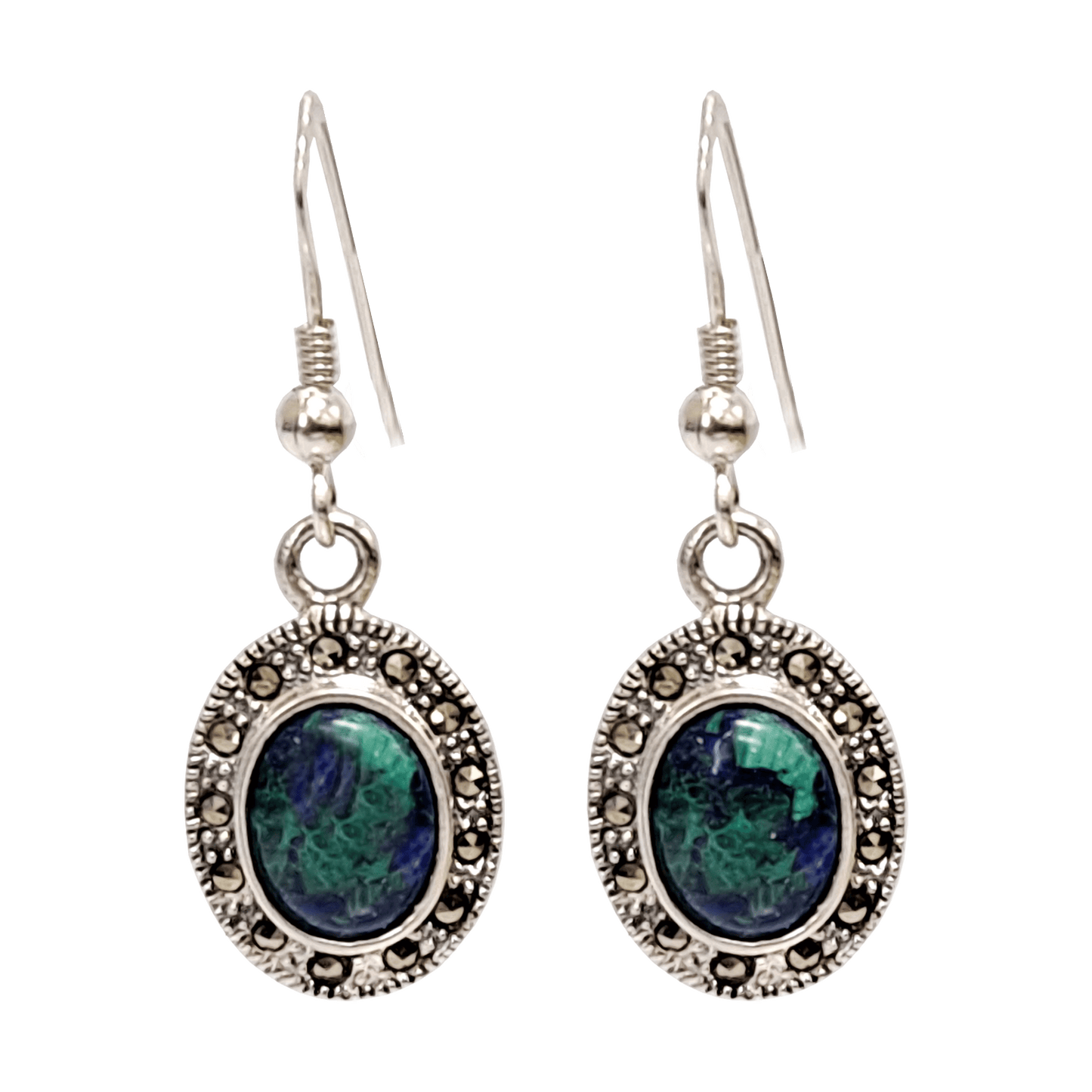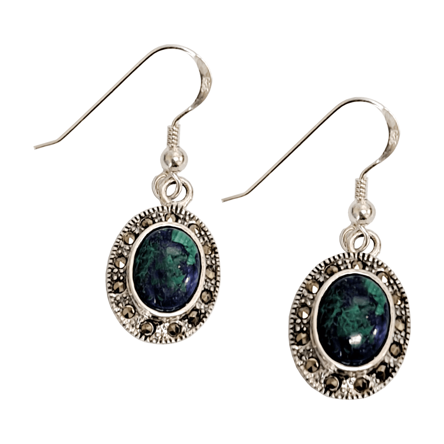 These elegant Eilat stone oval earrings feature vibrant blue-green stones set at the center, surrounded by a sparkling ring of marcasite. Combining the earthy Eilat stone and the shimmering marcasite creates a striking contrast. Dangling gracefully from fishhook style ear hooks, these earrings offer both movement and sophistication, blending natural beauty with timeless design. Perfect for adding a touch of elegance and uniqueness to any outfit.