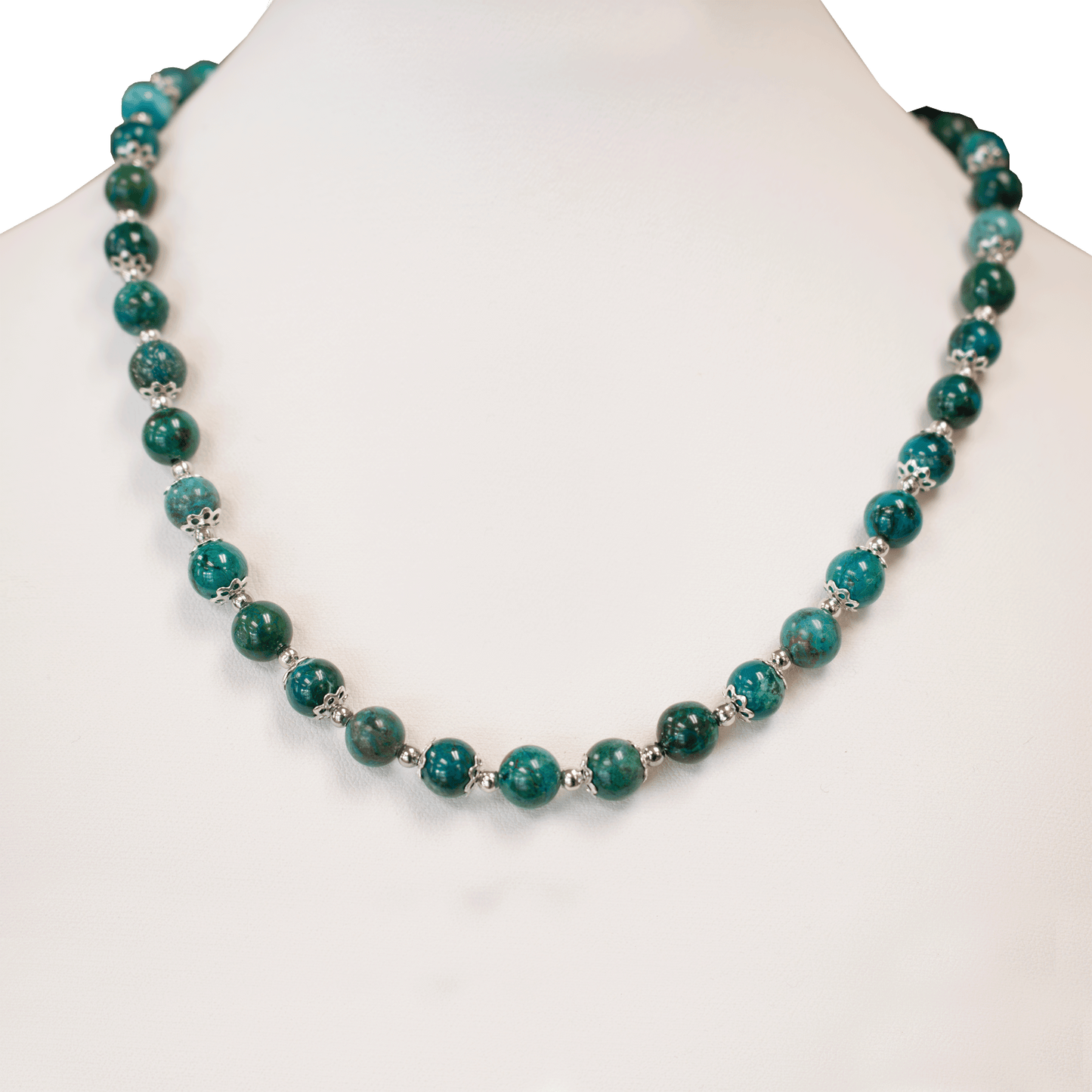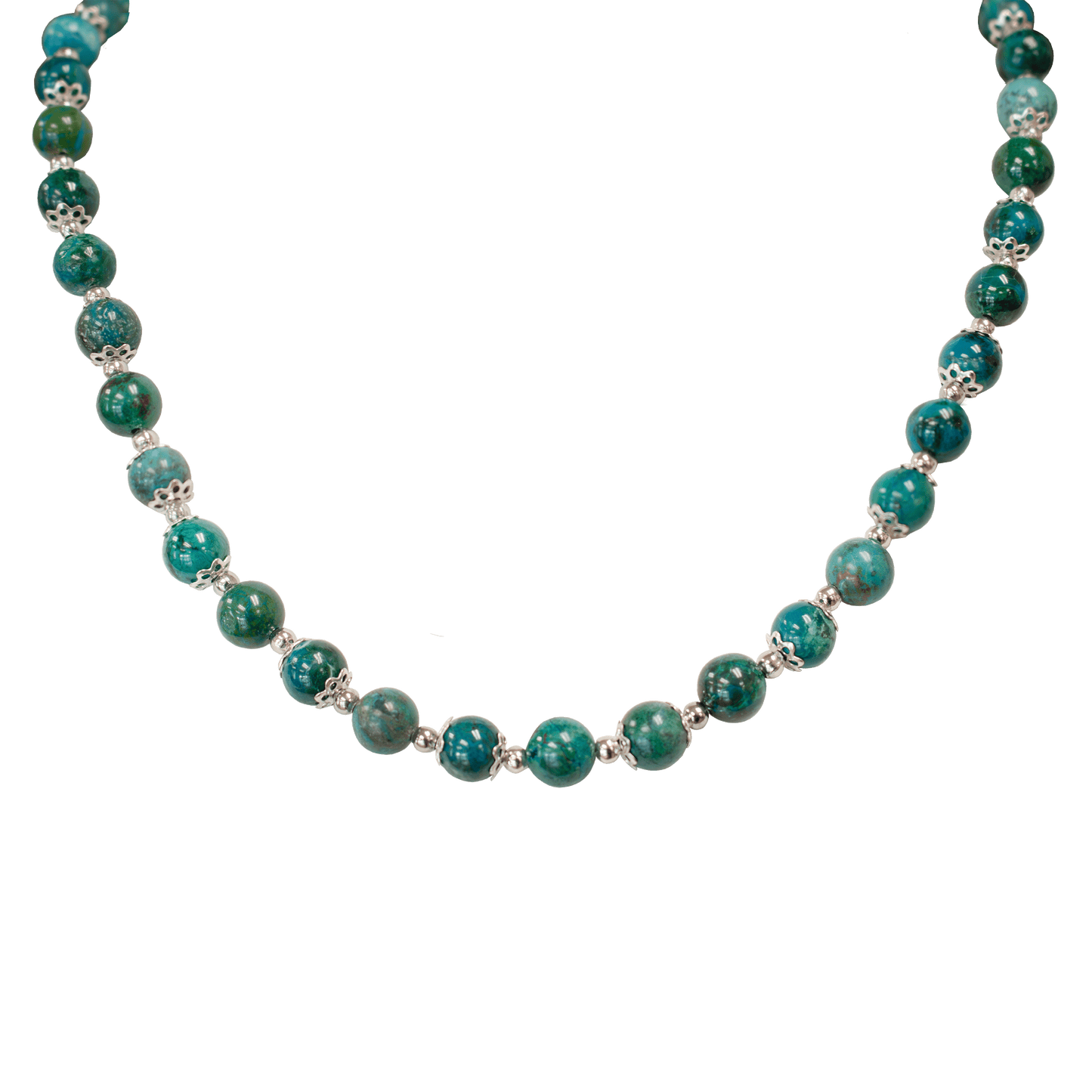 This Eilat stone beaded necklace measures approximately 17.75 inches, showcasing the captivating beauty of Israel’s national stone. Each bead features unique shades of green and blue, with natural variations that give the necklace its distinctive character. Smoothly polished and strung together, the beads form a harmonious design that reflects the earthy elegance of the Eilat stone. The necklace's medium length makes it perfect for everyday wear or special occasions, offering a subtle yet striking statement of natural beauty and timeless craftsmanship.