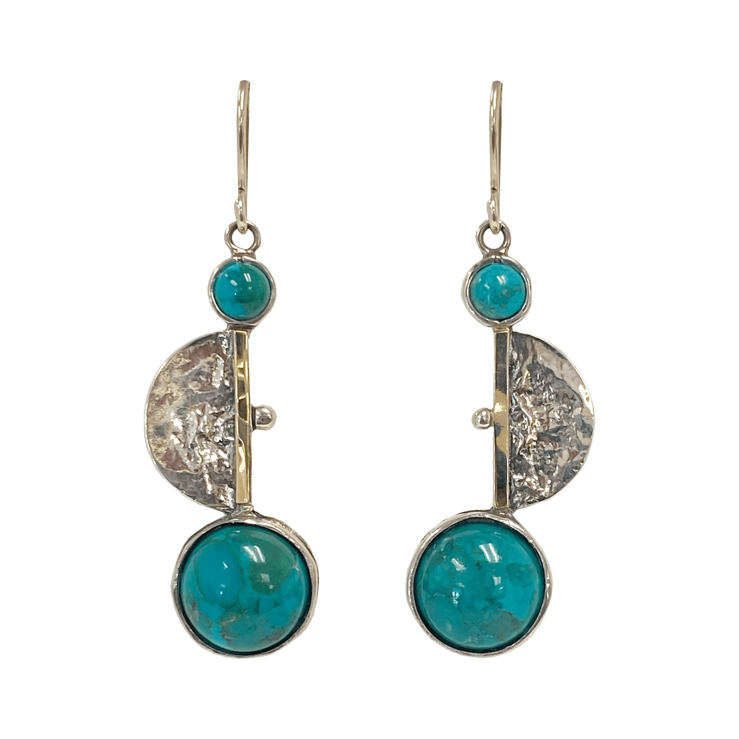 These stunning Eilat Stone & Sterling Silver Drop Earrings feature a unique and artistic design. A small, round Eilat stone in vivid green hues sits at the top, followed by a sleek sterling silver hammered half-moon accent. Below is a larger round Eilat stone that sits gracefully, creating an elegant contrast between the stones and silver. The combination of natural beauty and modern design makes these earrings a captivating accessory, perfect for adding a touch of sophistication and style to any look!