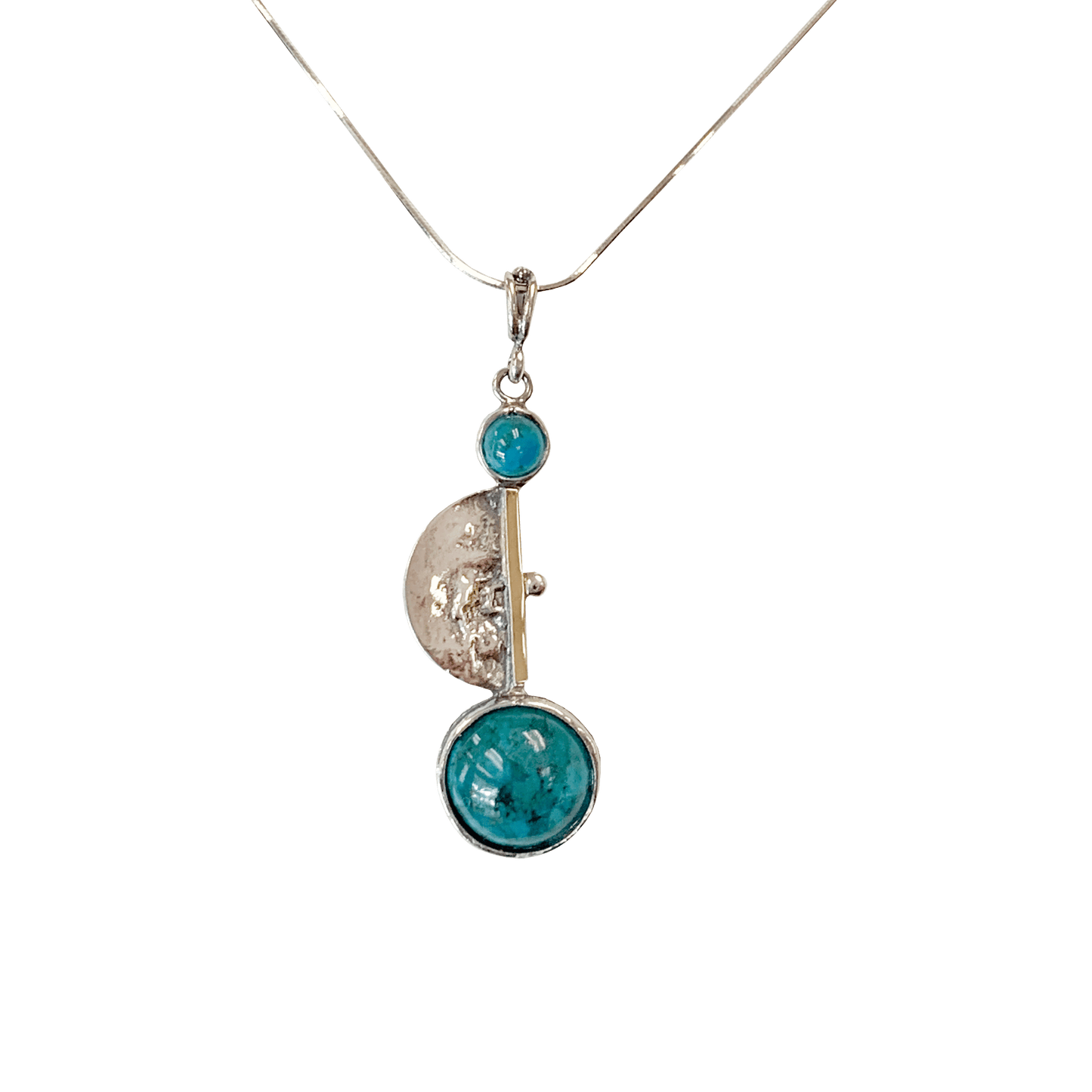 This stunning Eilat stone necklace features a unique two-stone design set in sterling silver. A small Eilat stone rests at the top, connected to a gracefully arched silver half-circle, which leads to a larger round Eilat stone below. The stones’ vibrant blue-green hues reflect the natural beauty of Israel's national gemstone, making this necklace a striking and meaningful accessory.