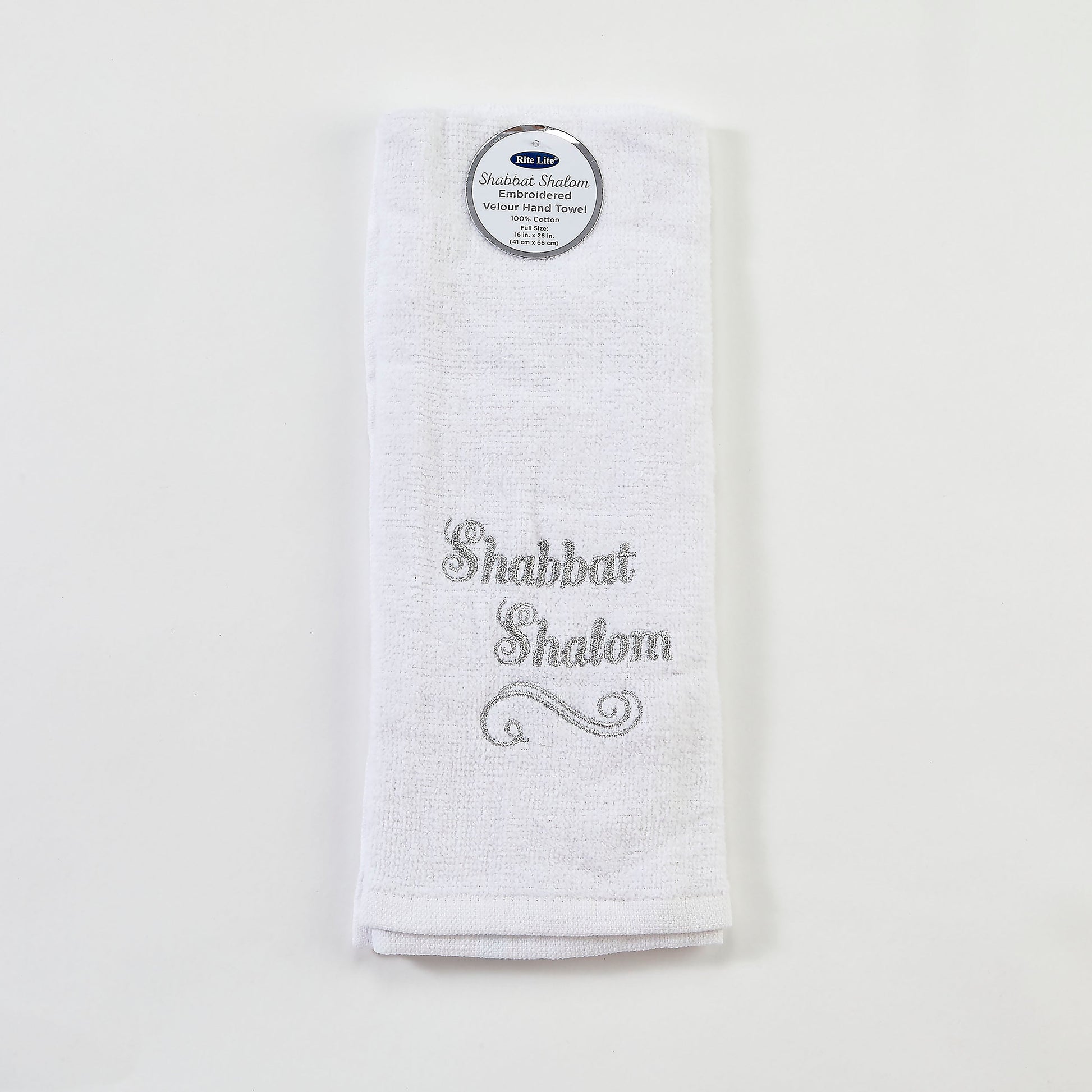Welcome and share the blessing of "Shabbat Shalom" with this classic hand towel! Its meaningful message, embroidered silver upon a white cotton towel, helps create an aura of warmth that is so special to Shabbat. This towel is a thoughtful gift for oneself or for family & friends.