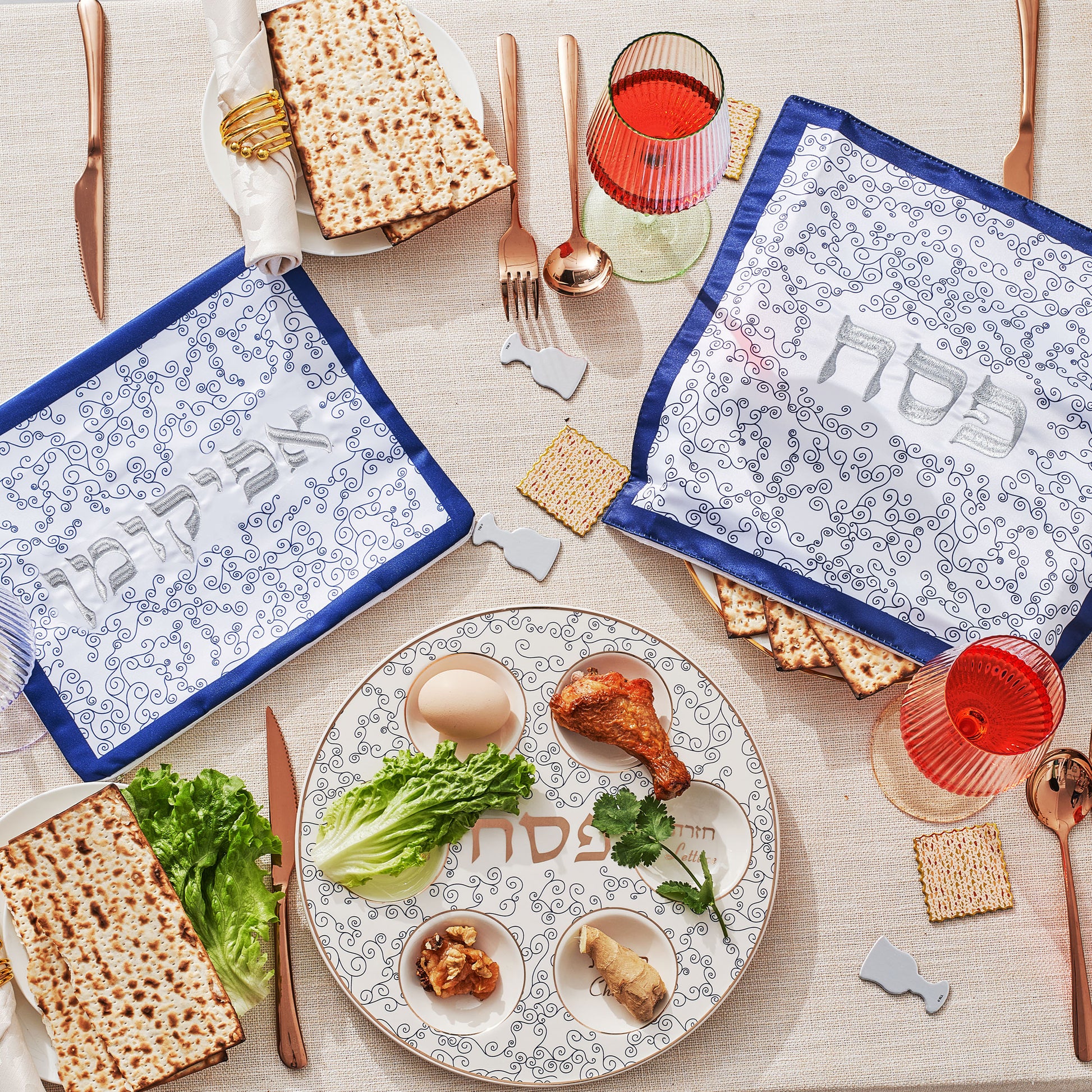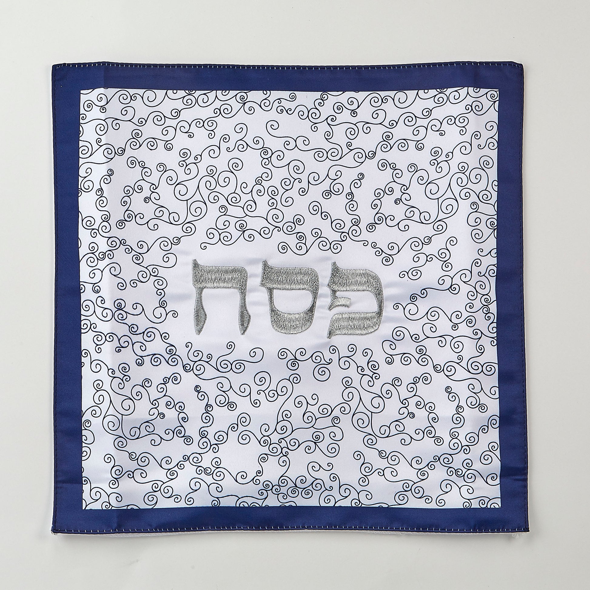 - A Modern Blue & White Curlicue Design with Silver Accents to Match Any Table! - Each Cover Features 3 Pockets to Keep 3 Matzahs.