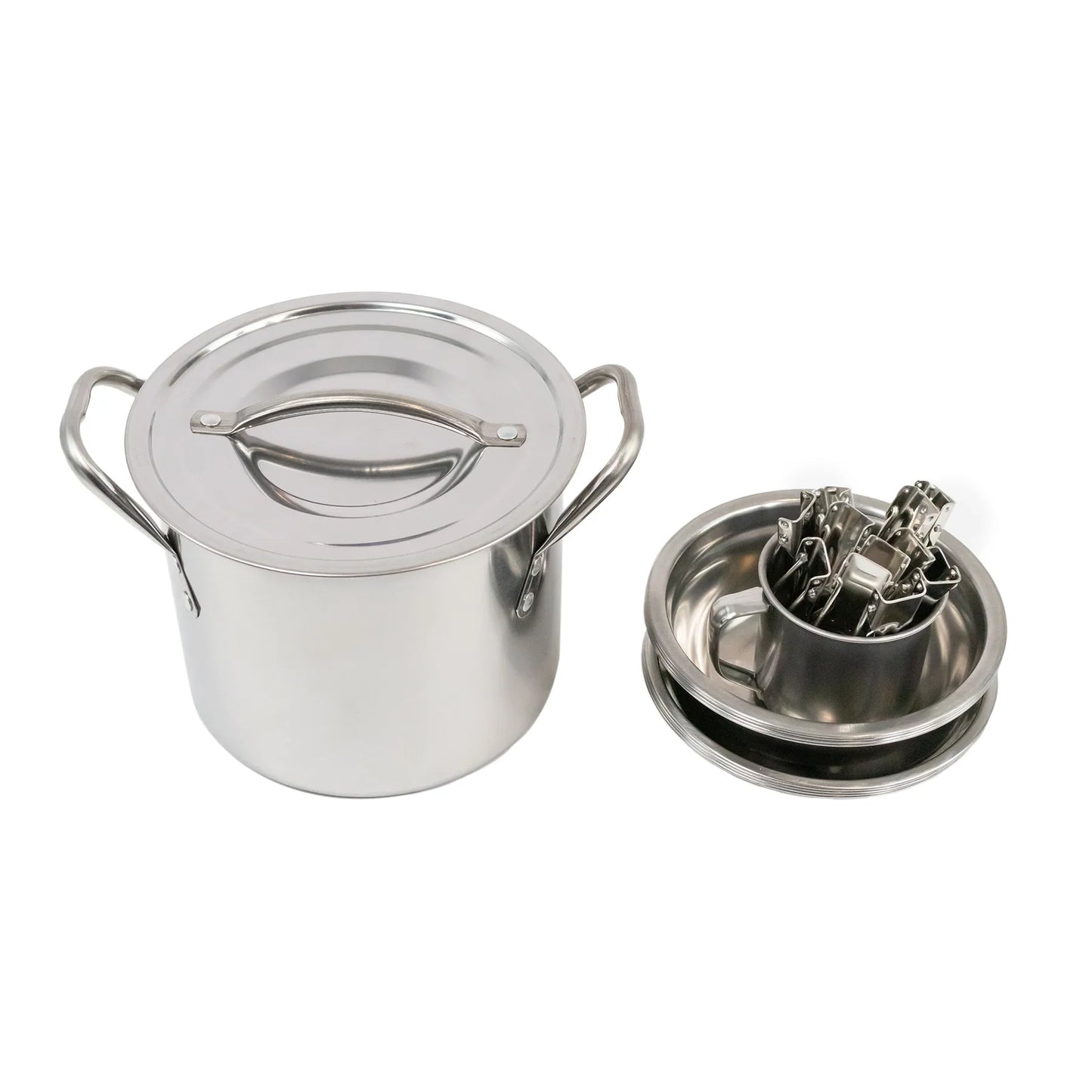 Emergency Zone's 4 Person Stainless Steel Cooking Set is made with a backpacker's needs in mind. All pieces are contained inside a stainless steel pot which provides an efficient and compact way to store all the dishes. The pot holds approx. 11.5 cups of water, which makes it ideal for cooking freeze dried food or other hot meals. Because of its light-weight, compact design, this kit is perfect for sheltering in place, camping, or hiking.