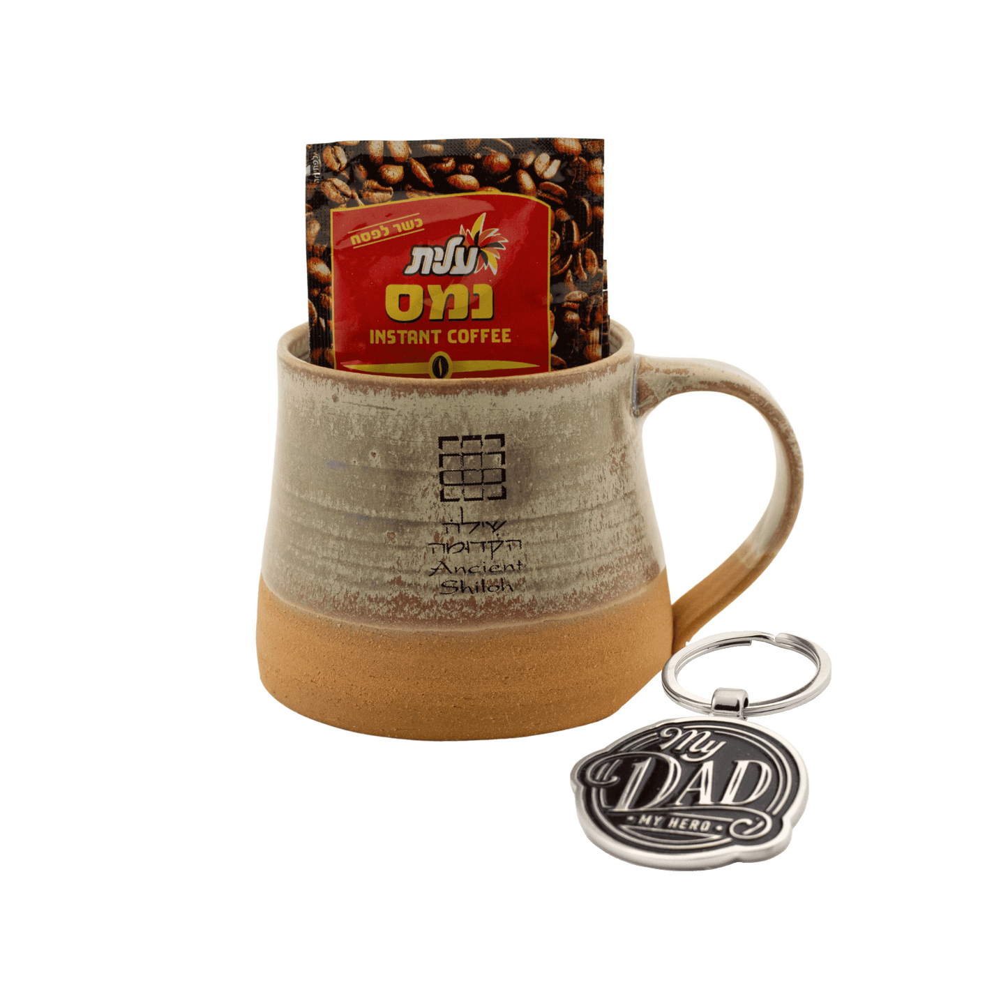 This Father Hero Gift Set is the perfect blend of warmth and appreciation. The ceramic mug, with a rich tan glaze enveloping the inside and outside, then revealing the natural stoneware at the bottom, boasts a decorative black breastplate design with "Shiloh" in both English and Hebrew. Accompanied by 4 packs of instant coffee for a quick and delightful brew, and a "My Dad, My Hero" keychain to express your admiration. All are handsomely presented in a white box, making it ready for heartfelt gift-giving. Celebrate your dad with this thoughtful and meaningful set.