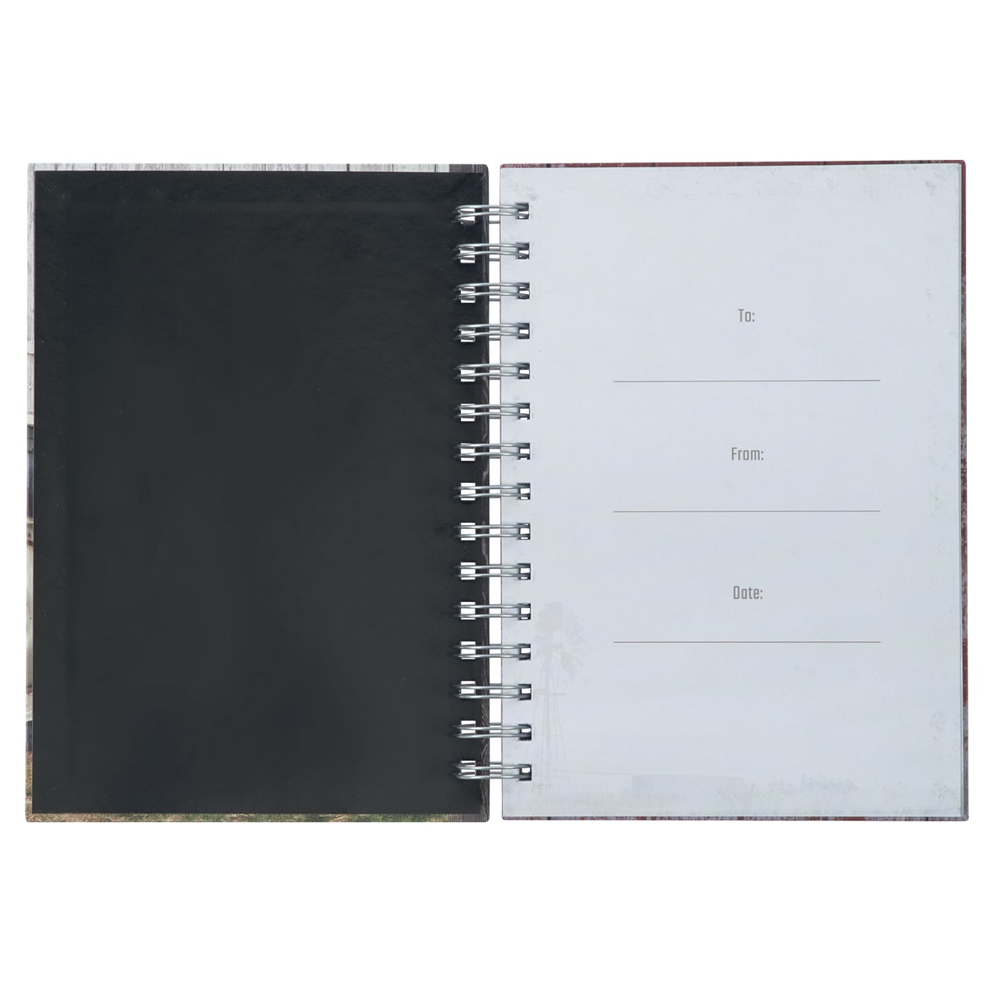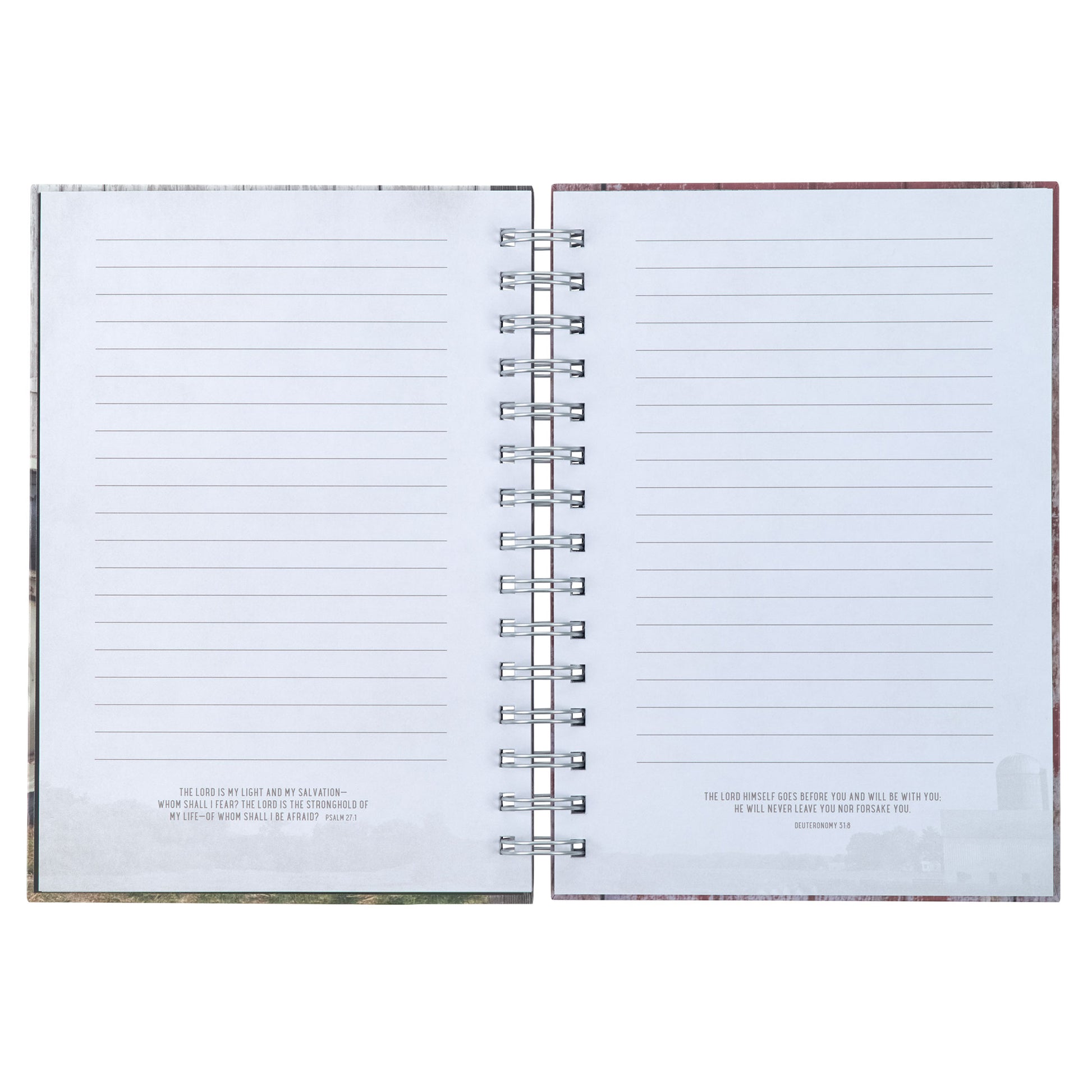 The dusty white interior pages and journal covers are bound together by silver metal wire binding. There are 192 pages, all lined, each featuring a Scripture verse at the bottom and a watermarked farm design that spread across two pages. In addition, a presentation page is included at the front of the journal. This page can be personalized and inscribed with a meaningful message to celebrate a memorable occasion.