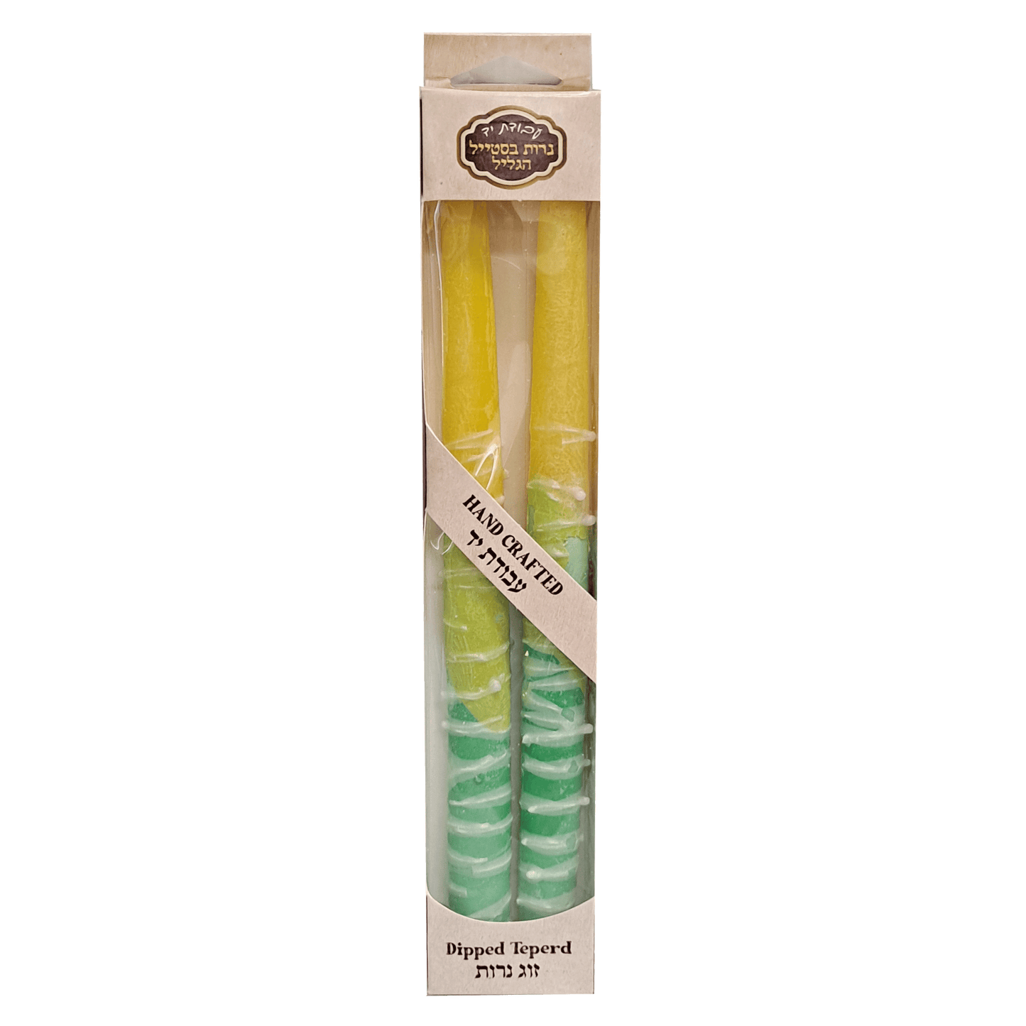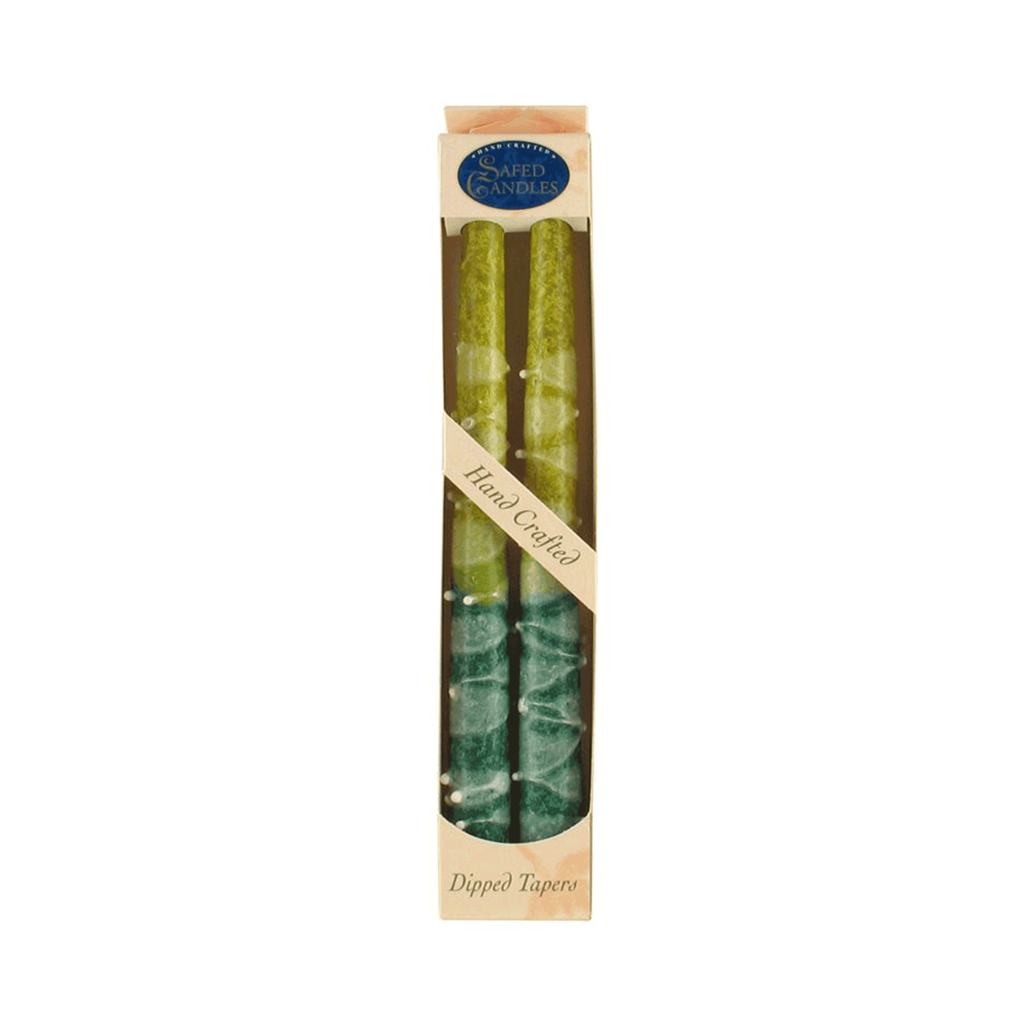 Add color and joy to your dining table with these stunning taper candles. These elegant shades of green candles feature decorative white wax beads that add elegance and sophistication. Handcrafted in Israel using the ancient dipping method, these candles carry a rich tradition. Perfect for Shabbat, holidays, and festive meals, each package contains two tapers.