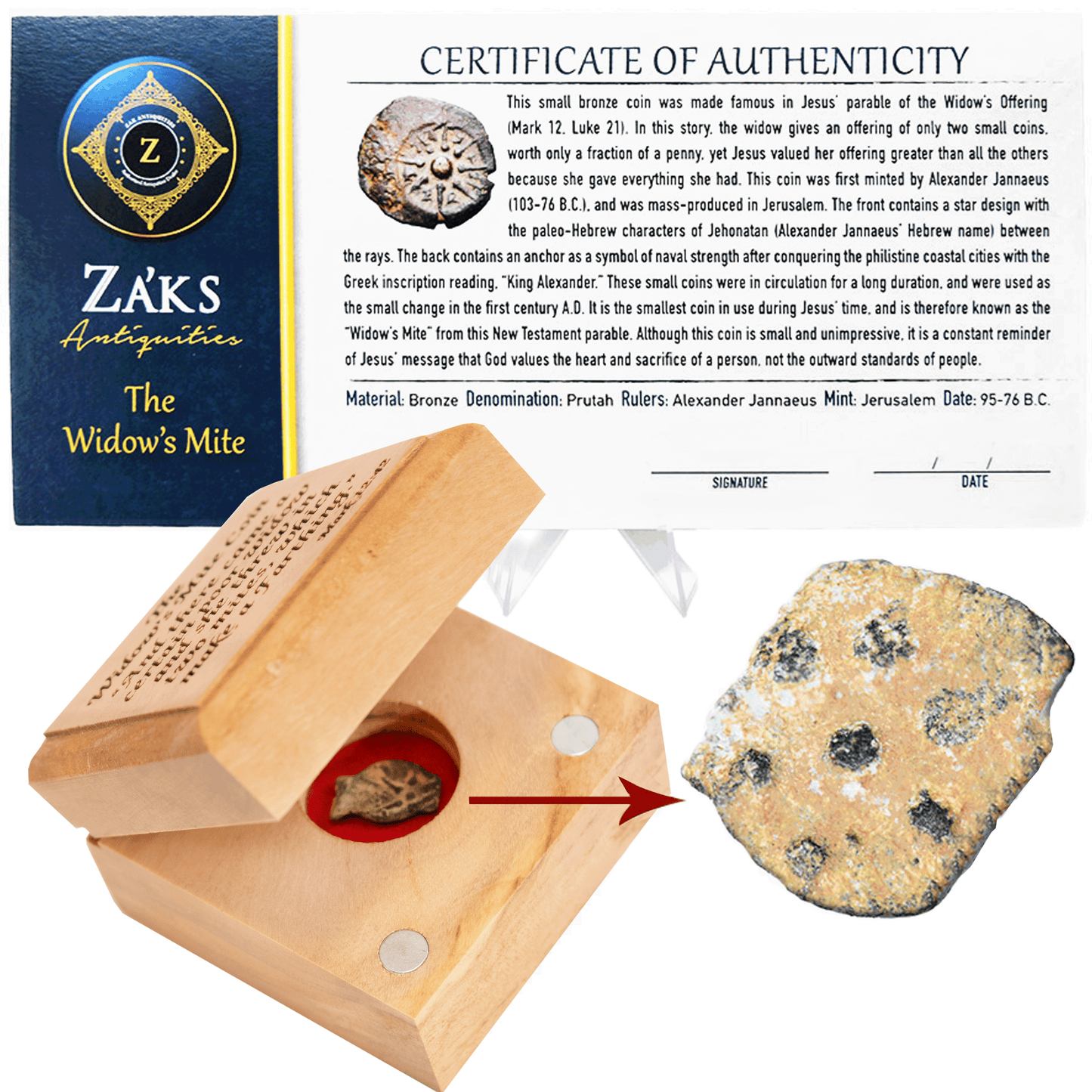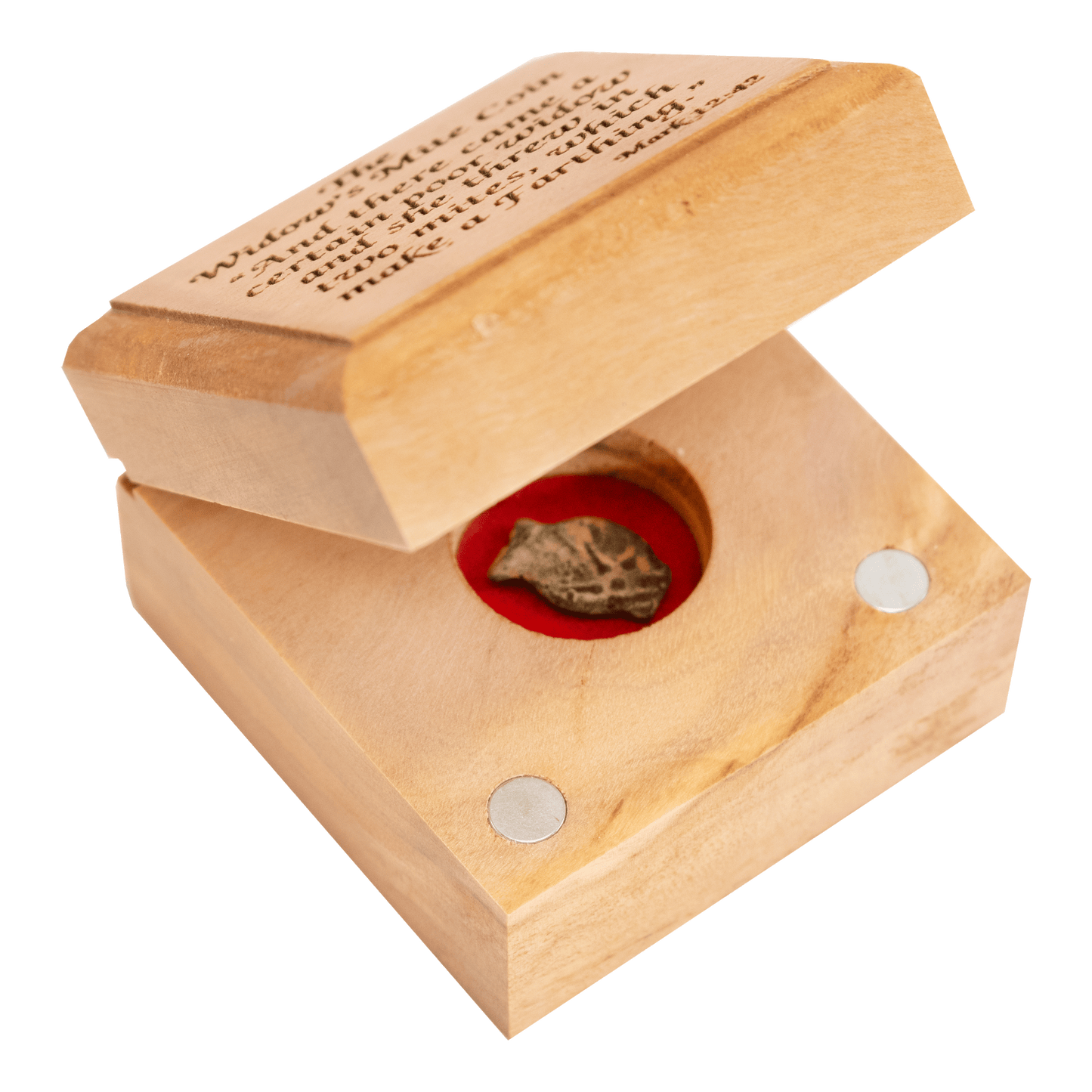 This genuine 2000-year-old coin is a piece of history that brings to life the teachings of Jesus. It comes in a beautiful engraved olive wood box with velvet lining, 100% handcrafted in Israel. The box comes in various designs and is perfect for the display and protection of the coin.