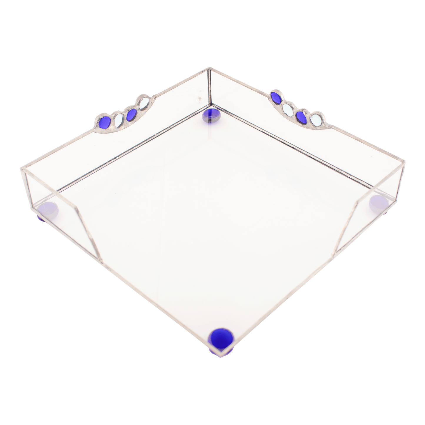 This elegant clear stained-glass matzah tray is a stunning addition to your Passover table. The tray is adorned with delicate blue and clear decorative stones, adding a touch of color and sparkle to the design. The clear stained glass beautifully showcases the matzah, while the blue accents provide a serene, sophisticated look. Perfect for holding matzah during your Seder, this tray combines functionality with artistry, making it a meaningful and stylish piece for your holiday celebrations.