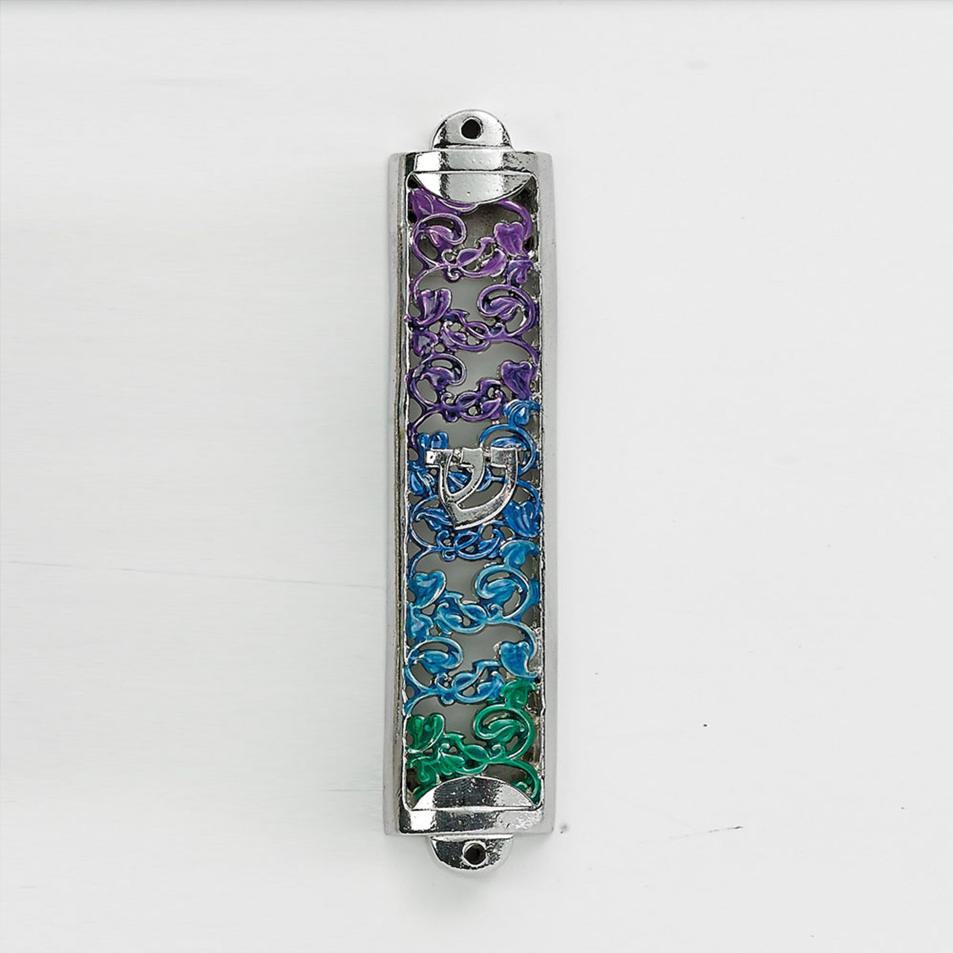 Awaken your doorway with this colorful and sophisticated Mezuzah case! Beautiful tones of purple, blue and green in enamel filigree allows the scroll to be seen to enhance the character of your Mezuzah presentation.