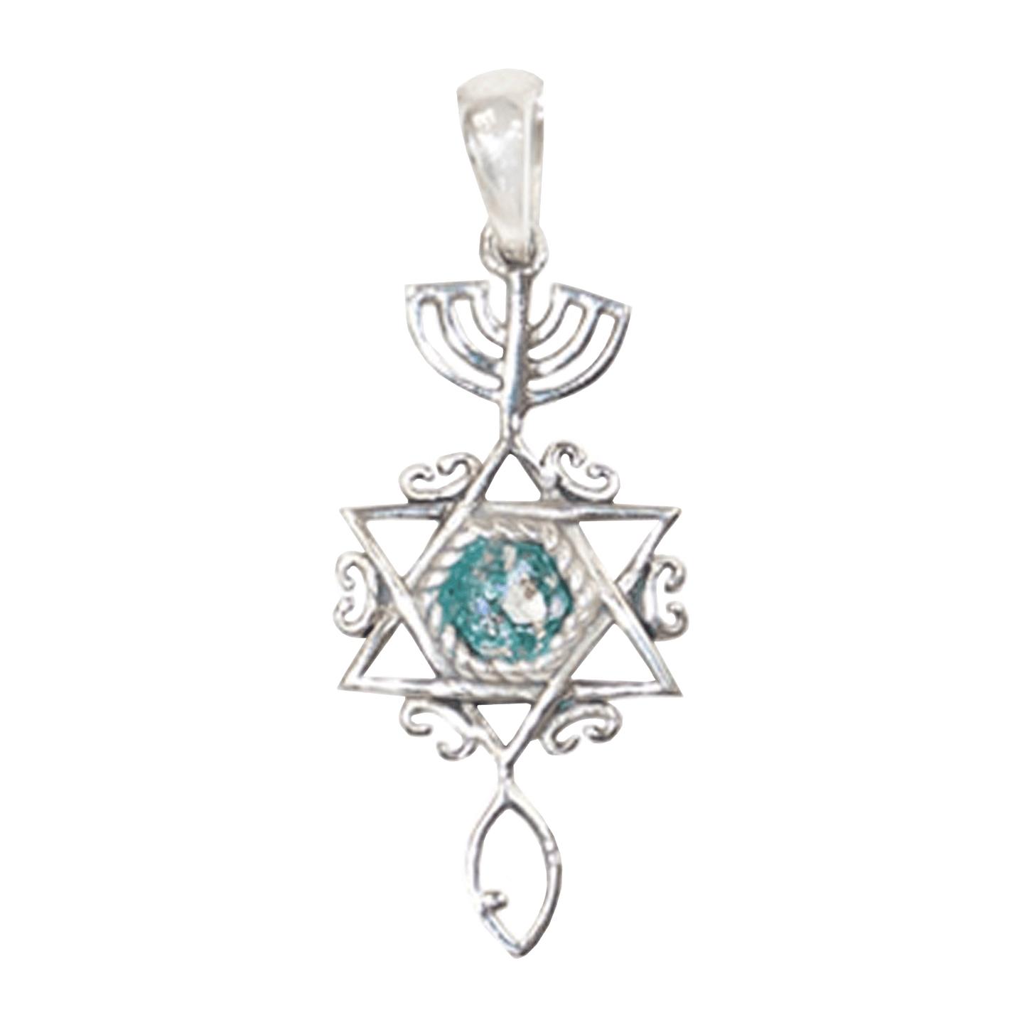 Featuring the sterling silver grafted-in symbols of a menorah, Star of David, and Fish - this necklace also displays a stunning round piece of roman glass which is set in the center of the star. Perfect to give as a gift to yourself or a loved one, this item will certainly be cherished for years to come.