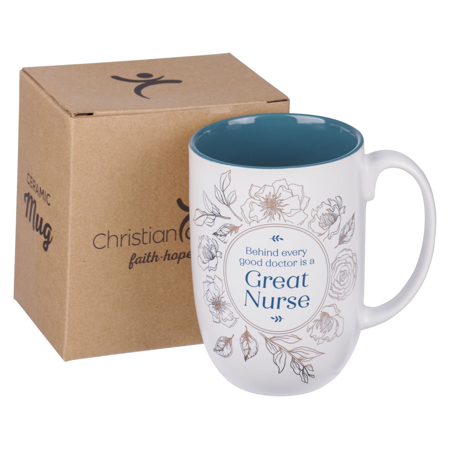 The matte white exterior and teal-glazed interior create a sophisticated design. The elegant mug has a generous 15-fluid-ounce capacity that holds nearly two standard cups of liquid, perfect for nurses who need a hearty drink to start their busy day! The comfortable three-finger grip with an oval handle ensures a secure and pleasant hold, even during the busiest moments. It is shipped in a tuck-top Kraft cardboard box that is easy to gift-wrap.