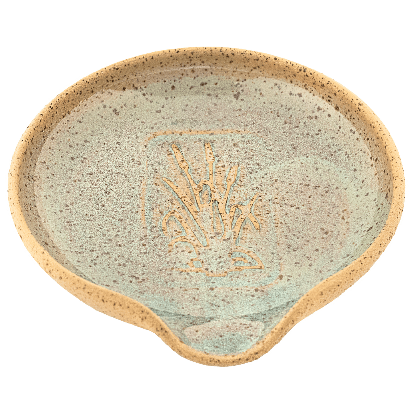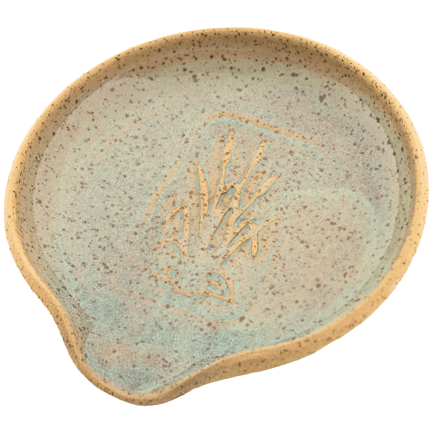 This lovely spoon rest is convenient and beautiful. The spoon rest protects countertops from saucy spoons and spatulas. Handcrafted in Israeli, the spoon rest features a reed motif and a gorgeous glaze.