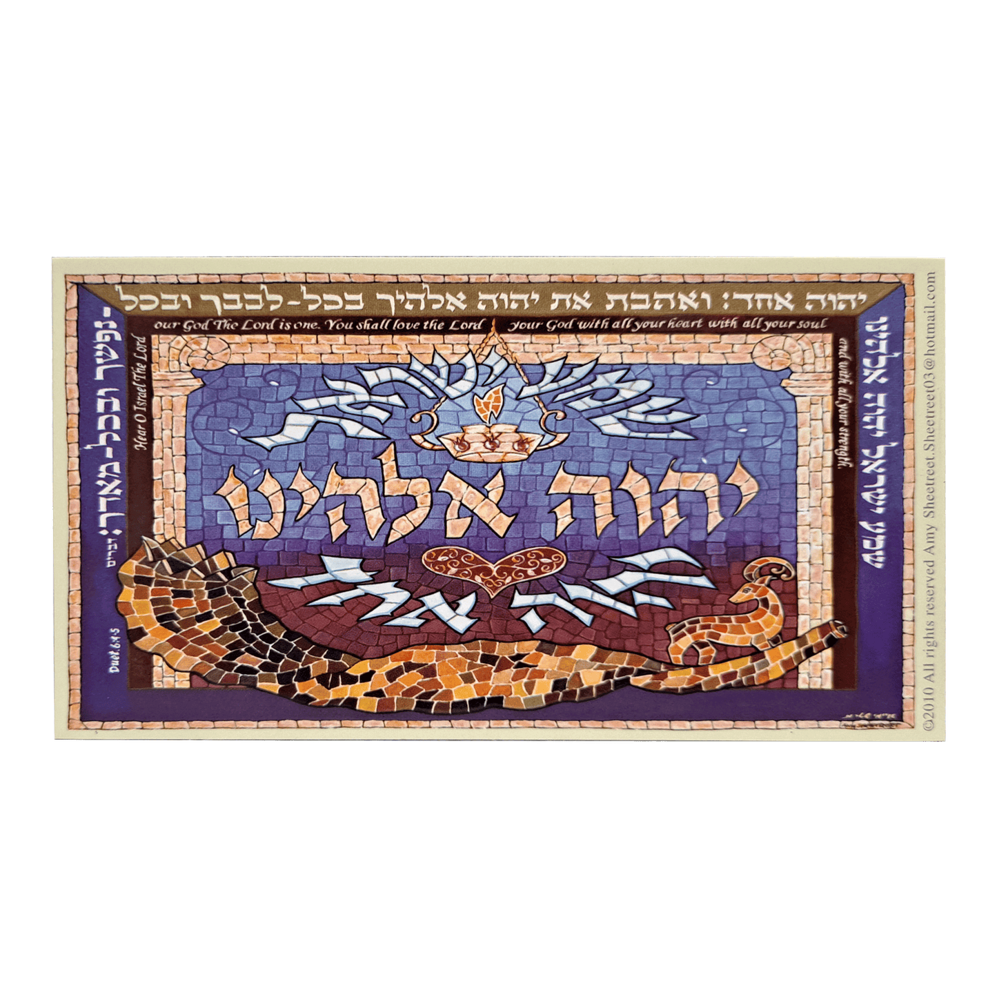 This inspiring magnet, "Hear O Israel" by Amy Sheetreet, beautifully illustrates the foundational declaration of faith from Deuteronomy 6:4-5. At the top, the Hebrew phrase Shema Yisrael (Hear O Israel) is displayed, with Jehovah is our God prominently written across the center in Hebrew. The design reflects the deep spiritual significance of the Shema, reminding us to love and serve God with all our heart, soul, and strength. Perfect for any magnetic surface, this magnet is a meaningful expression of faith and devotion.