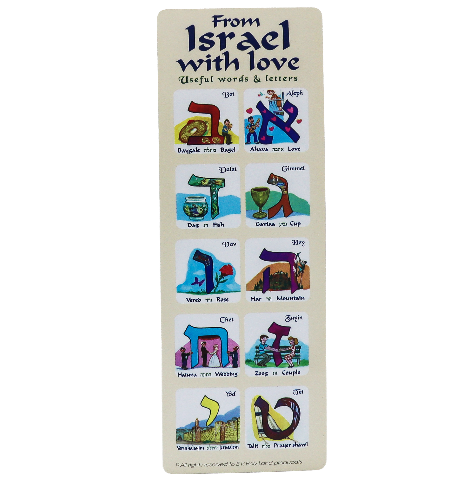Hebrew alphabet bookmark that is made from heavyweight stock and laminated. Measures 6 1/2" X 2"