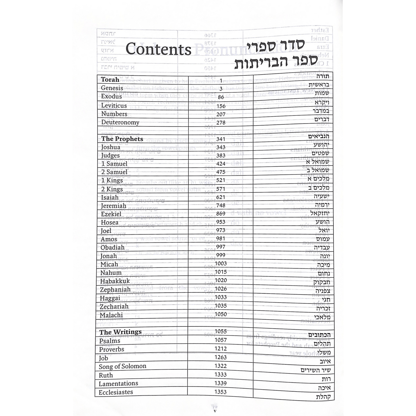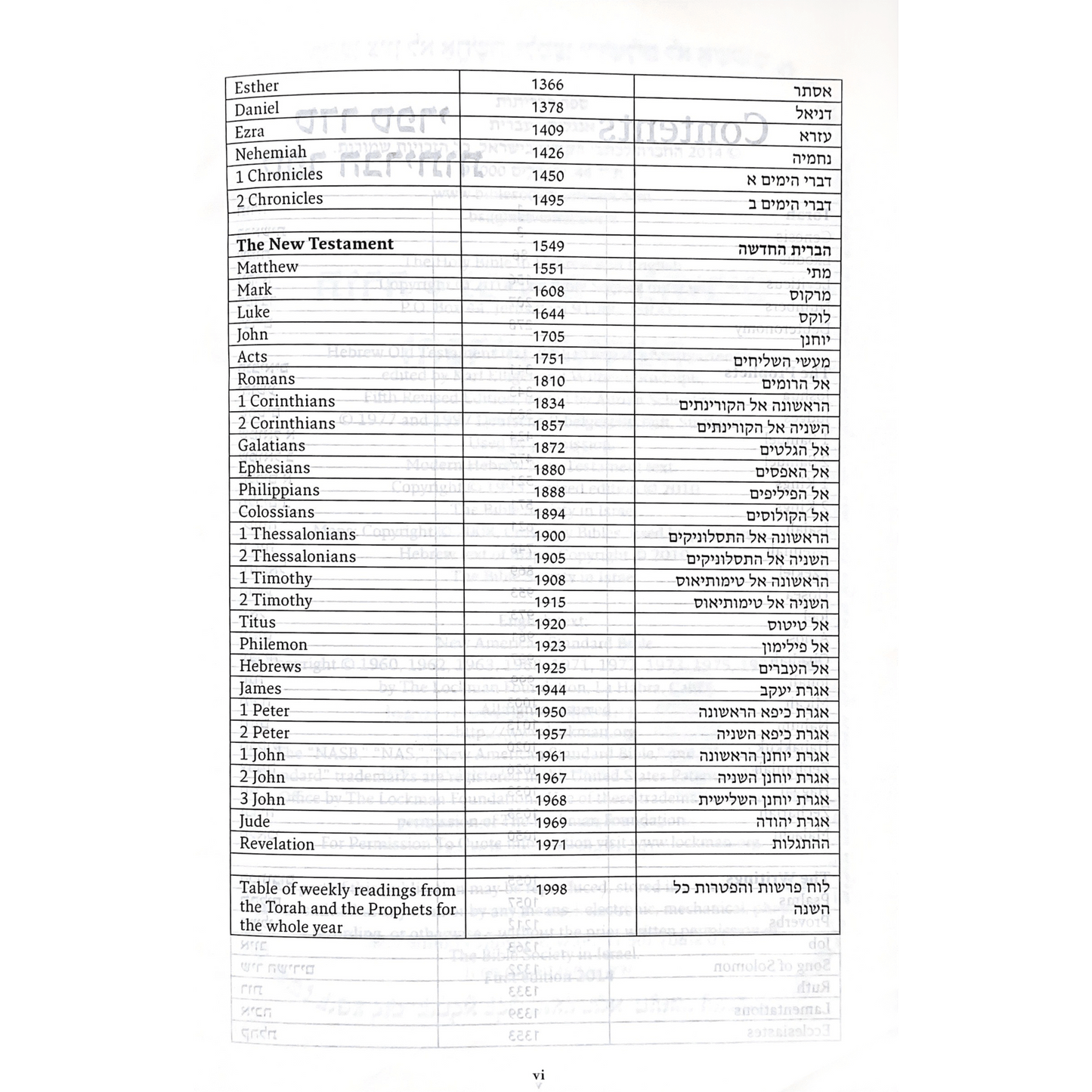 The Hebrew is taken from the Masoretic text for the Old Testament and the Modern Hebrew translation for the New Testament. The English is taken from the New American Standard Bible (NASB). The Hebrew is side by side to the English from Genesis to Revelation.