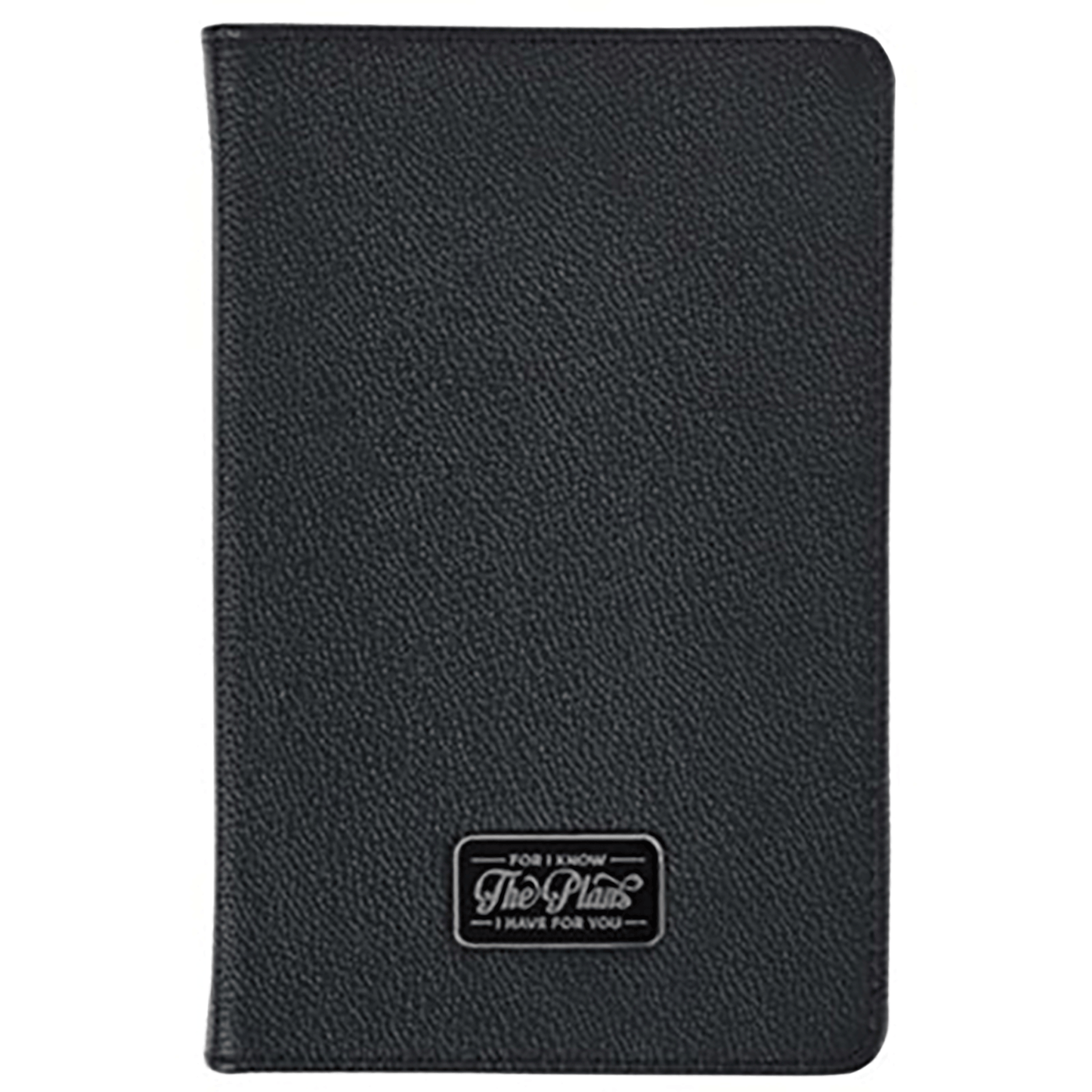 The cover features foil-stamped lettering and a Scripture quote badge, "For I know the plans I have for you." The design speaks to both elegance and spiritual resonance. Measuring approximately 7.75" x 5", the journal is a perfect size for portability and ease of use. Delivered in a canvas bag, this journal is an accessory and a cherished gift, ready for presentation and storage.