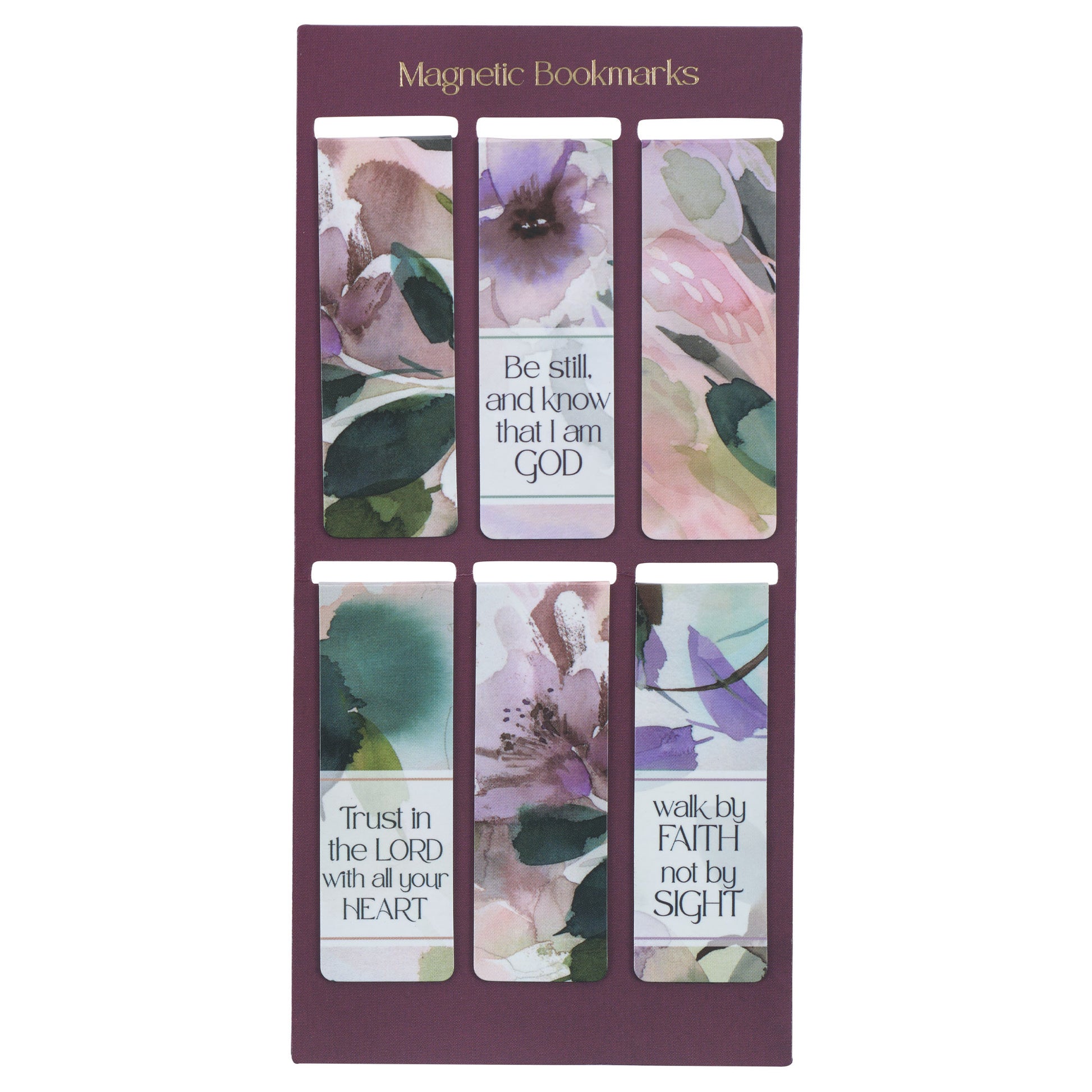 Soft watercolored flowers in jewel tones set the stage for the faith-filled sentiments of the six bookmarks in the Bloom Like the Flowers Magnetic Bookmark Set. The following sentiments appear on three of the bookmarks. Three bookmarks only feature floral designs without text.