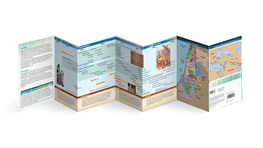 See over 60 of Israel’s key kings and prophets across seven centuries at a glance! This fold-out pamphlet filled with time line, charts, and a map covers key events & people from King David to Elijah! Imagine having a slimline timeline with dozens of the top Old Testament kings and prophets with overviews (dates, key facts, Bible verses, etc.) at your fingertips that can easily fit inside most Bible covers!