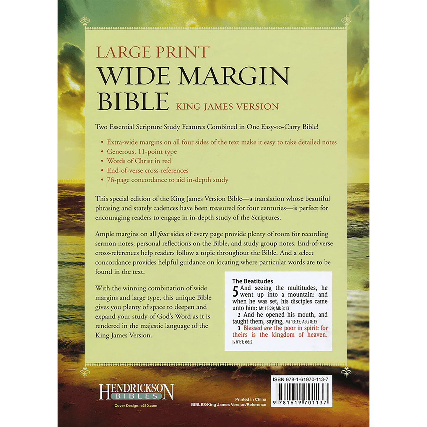 This special edition of the King James Version Bible provides generous margin space on three sides of every page. This extra space allows plenty of room for recording notes, personal reflections on the Bible, and study group notes. End-of-verse cross-references help readers follow a topic throughout the Bible. A select concordance provides helpful guidance on locating where particular words are to be found in the text.