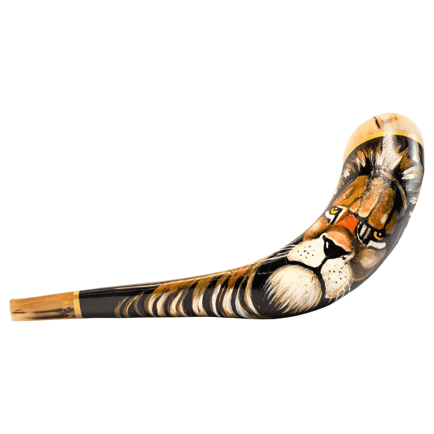 This unique ram horn is hand-painted in Israel and tested for sound quality. It measures 16.75" which makes it easy to carry with you or display as an elegant focal point in any room. The shofar is hand painted by renowned Israeli artist Sarit Romano with enamel colors, then finished with a lacquer to preserve its beauty. The ram horn features a stunning face of a lion and the words "Lion of Judah" across the side in gold letters. This is a unique shofar with a number and is part of a limited edition.