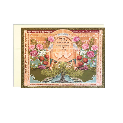 This gorgeous notecard is a wonder for the eyes.  It says in both Hebrew and English "I am My Beloved's and My Beloved is Mine" in the middle of the card right above the doves.