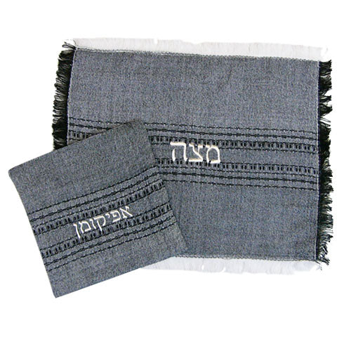 This is a unique and original Gabrieli hand-woven Passover set.  It is black and white with black decorative strips through the middle and embroidered silver lettering.  The Matzah cover has the Hebrew word מַצָּה "Matzah" and the Afikomen bag has the Hebrew word אֲפִיקוֹמָן "Afikomen" embroidered in silver.