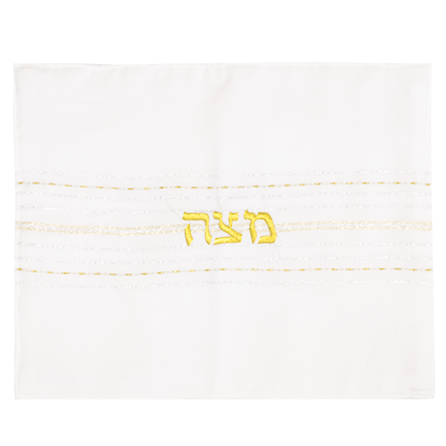 The beautiful white matzah cover has gold decorative stripes running through the middle of it.