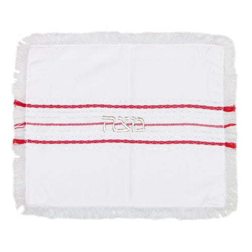 The beautiful white matzah cover has red and silver decorative stripes running through the middle of it.