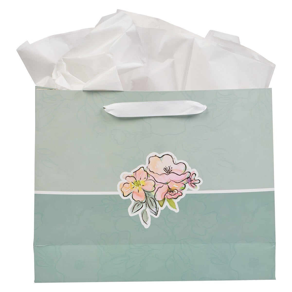 A thin white line separates a lighter teal top and a darker teal bottom on all four panels of this gift bag. Suspended in the middle is a white square, outlined in light gray, that is surrounded by pastel-colored watercolor flowers. The white square frame holds the sentiment that is presented in deep teal-blue-foiled scripted letters.
