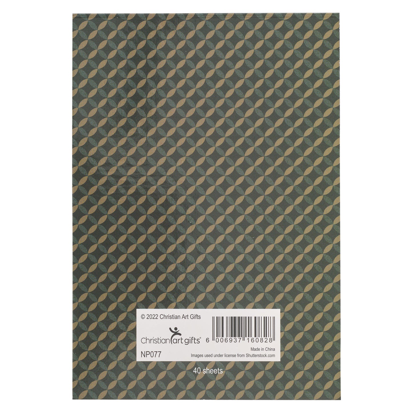The notepad's front cover features an image of a sweet white and golden puppy sitting against a faded green-gray backdrop. The border at the top of the notebook contains an abstract tone-on-tone green quatrefoil floral design and complements the colors used to print the sentiment and Scripture verse reference.