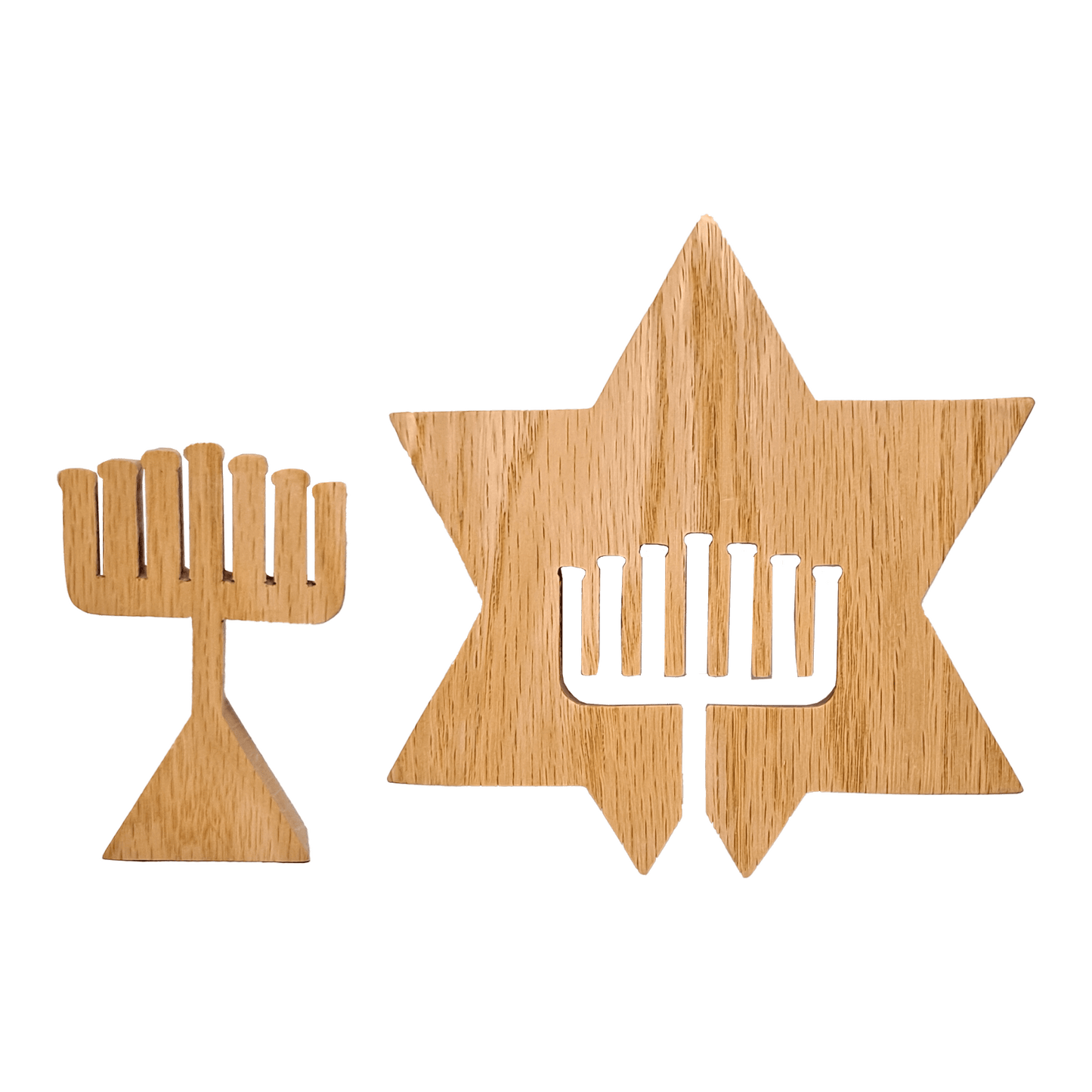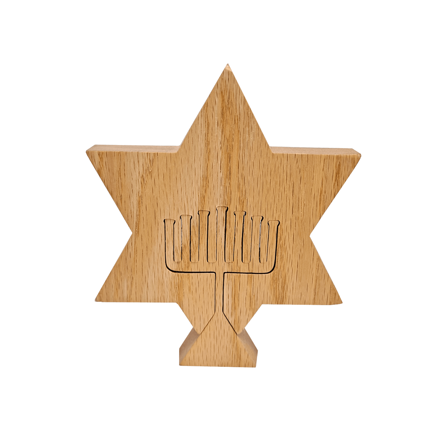 This is an oak wood Star of David with a cutout menorah, hand made by Seed of Abraham artist John Barone.