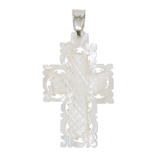 Bring a little style with our beautiful Mother of Pearl Cross Pendant, featuring a unique two-layer design. The bottom layer features an openwork pattern, allowing the beauty of the Mother of Pearl to shine through. Layered on top of it is a solid Mother of Pearl cross with an intricately carved delicate pattern. This pendant is ready for you to put it on your favorite chain.