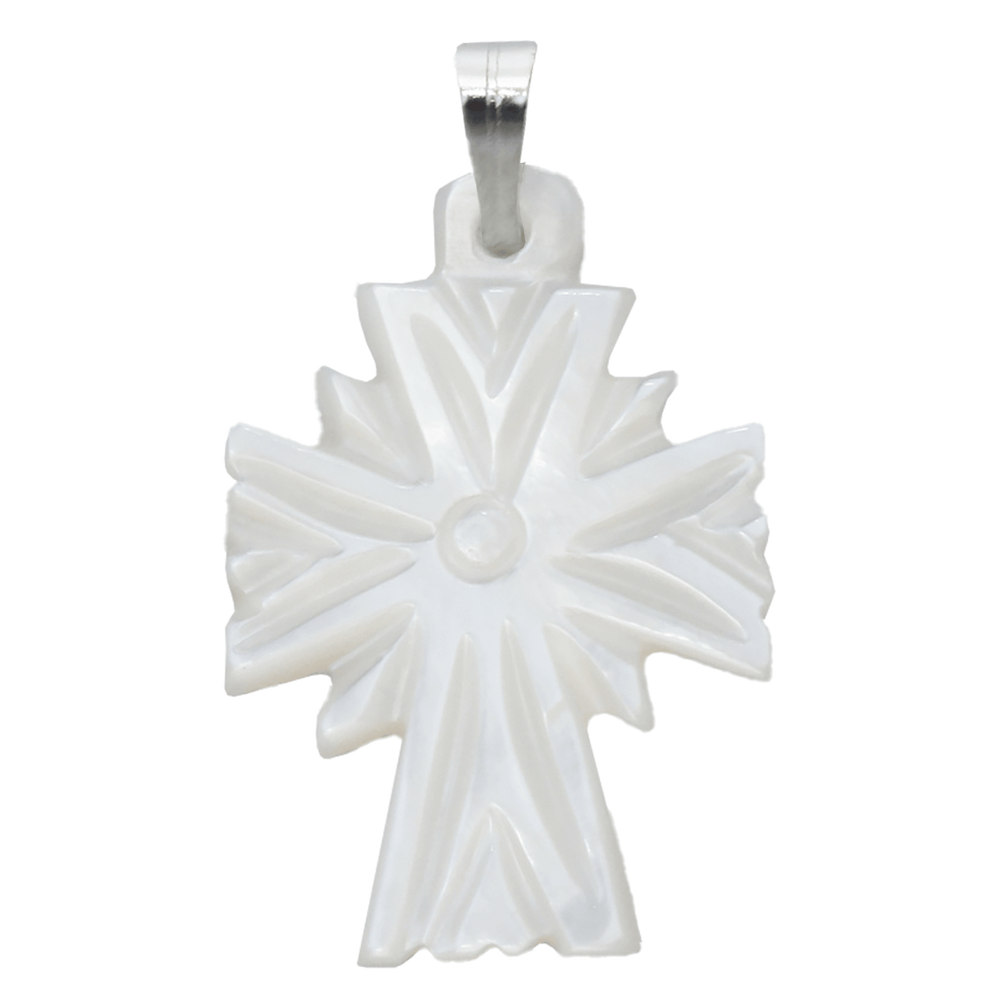 This exquisite Mother of Pearl Starburs Cross necklace features an intricately carved starburst design that radiates from the center of the cross. The stunning pendant showcases the natural iridescence of mother of pearl, with its luminous surface reflecting a spectrum of soft, shimmering colors.