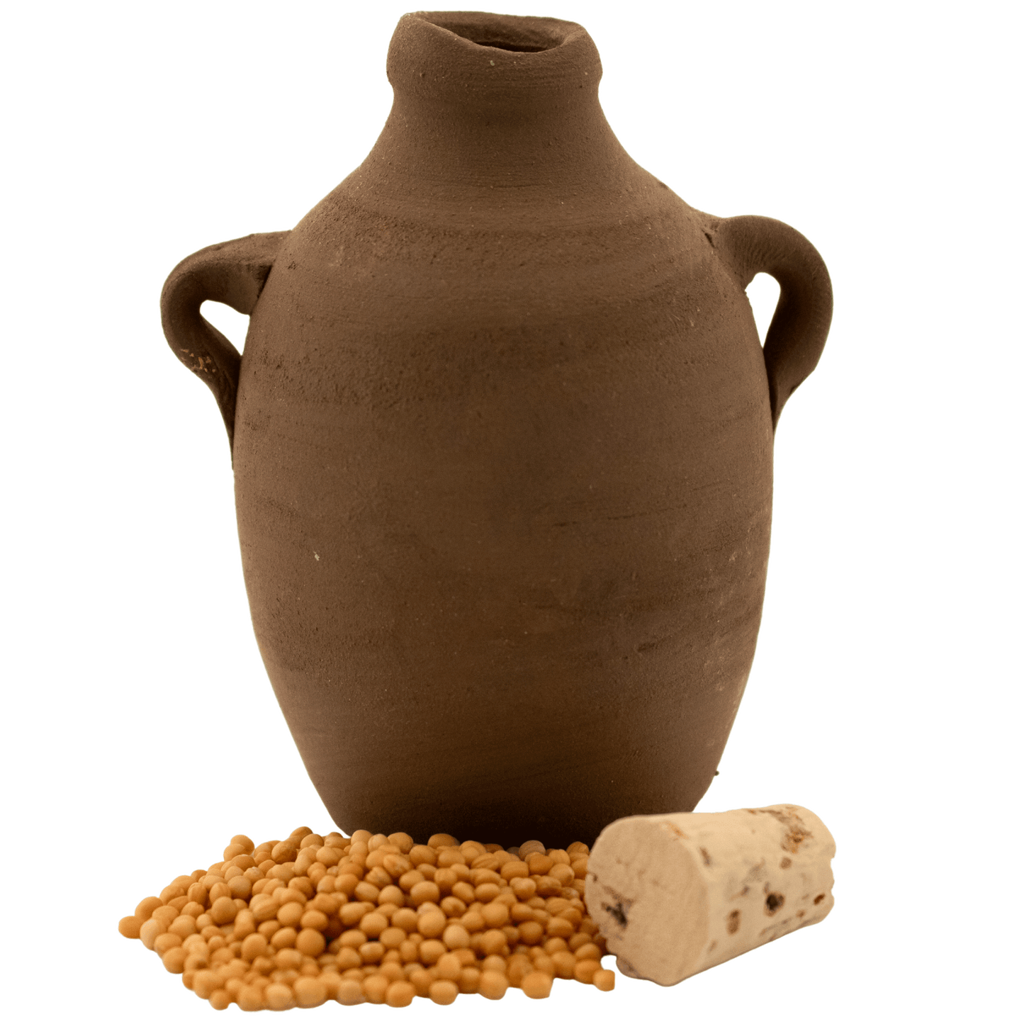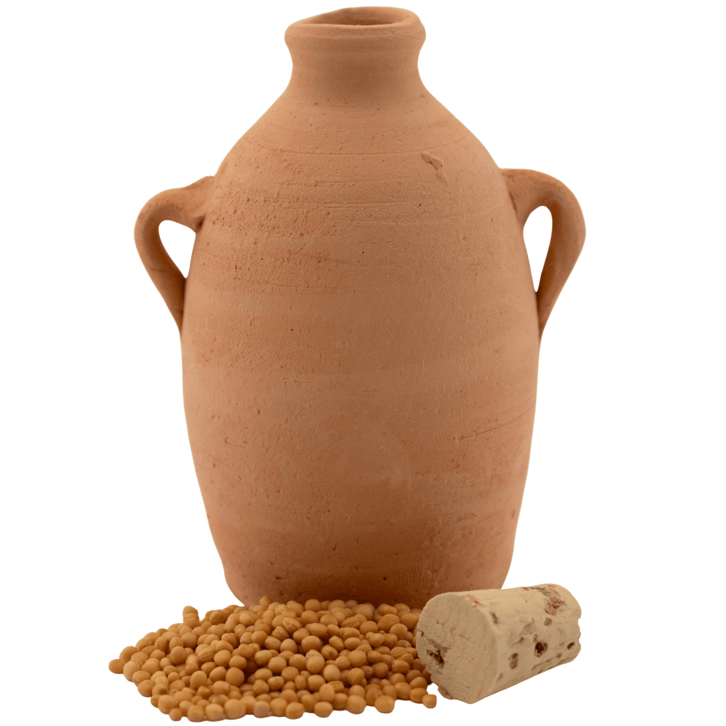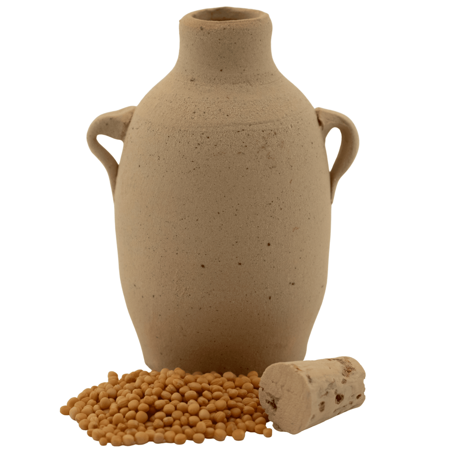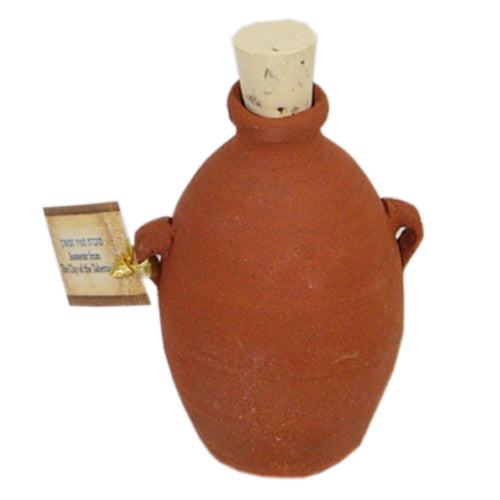 This is a handmade clay jar from Shiloh, Israel. It is filled with mustard seeds from the Holy Land and closed with a cork. The jar colors range from off-white clay to a terracotta clay.