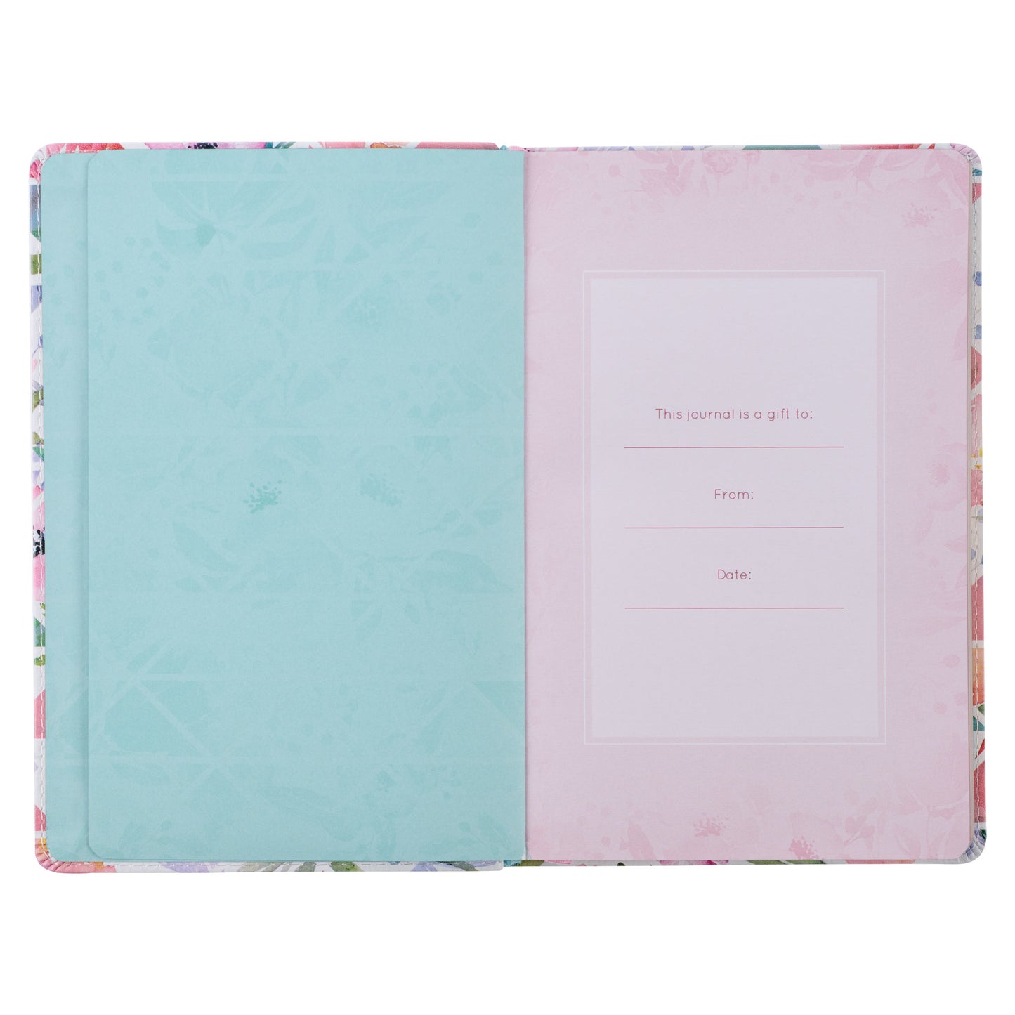A contemporary design of bright pastels, florals, and colorful triangles are plotted on a diamond grid against the white faux leather cover of the legacy journal. The title is presented in gold-foiled lettering captured by a white diamond-shaped frame with a gold-foiled border.