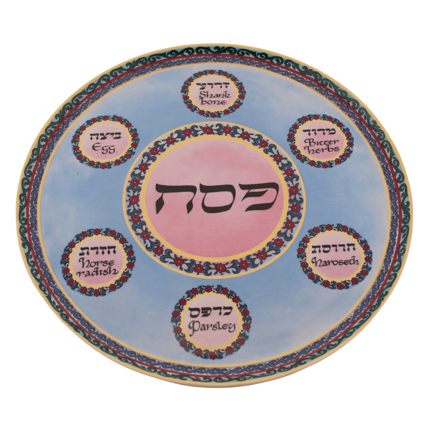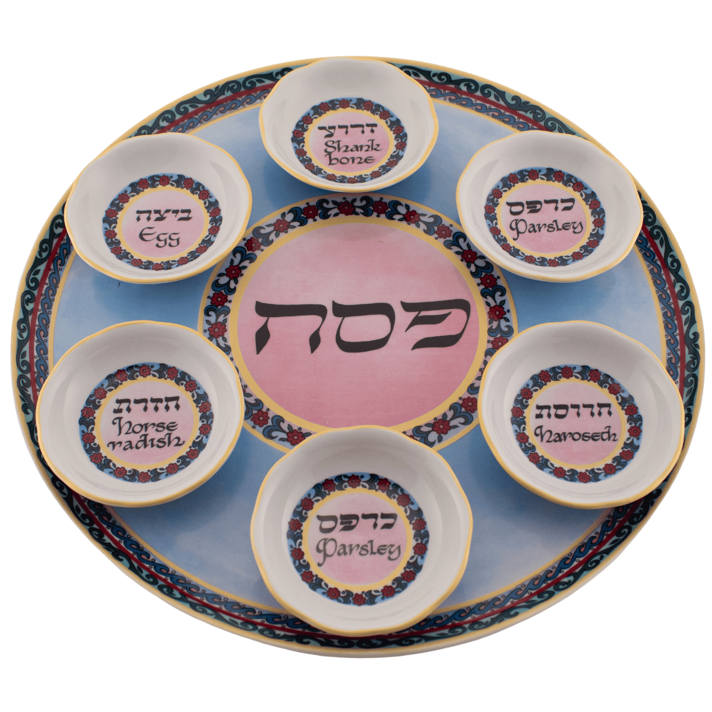 This elegant porcelain Passover plate, complete with matching element dishes, is a perfect blend of tradition and artistry. The plate features a striking blue outer circle and a soft pink inner circle, where "Passover" is beautifully inscribed in Hebrew (פסח). Each circle is rimmed by a floral border, adding a touch of refinement to the design. The matching element dishes are carefully labeled with the names of the Seder items in both Hebrew and English, ensuring a meaningful and organized celebration. This set not only serves a practical purpose but also adds a sophisticated, festive touch to your Passover table.