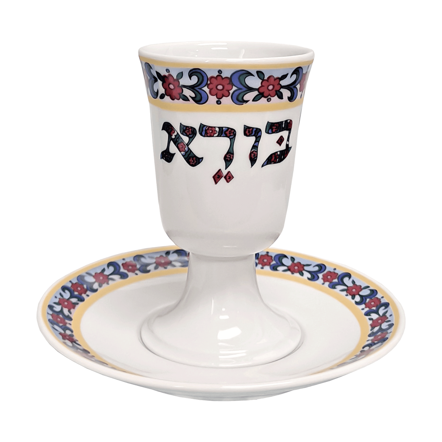 This elegant white porcelain Kiddush cup set features a delicate floral band that adorns both the rim of the cup and the matching saucer. The intricate floral design adds a touch of grace and beauty to the set, creating a timeless and sophisticated look. The Hebrew words "Creator of the Fruit of the Vine" (בורא פרי הגפן) are beautifully integrated into the floral motif. Perfect for Shabbat and holidays, this Kiddush cup set combines tradition with refined artistry, making it a cherished piece for your table.