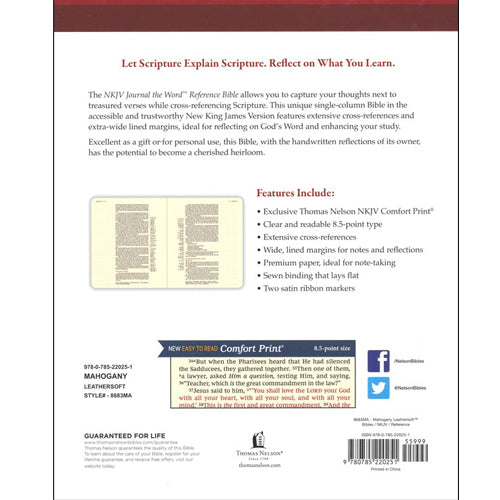The NKJV Journal the Word Bible is a trustworthy and indispensable resource for anyone who puts pen to paper for deeper engagement with God's Word. The extra-wide lined margins make this Bible ideal for note taking or journaling, underlining Scripture, or expressing your thoughts through journaling. The NKJV Journal the Word Bible is truly inspirational from cover to cover and sure to make an excellent gift as a treasured personal keepsake.